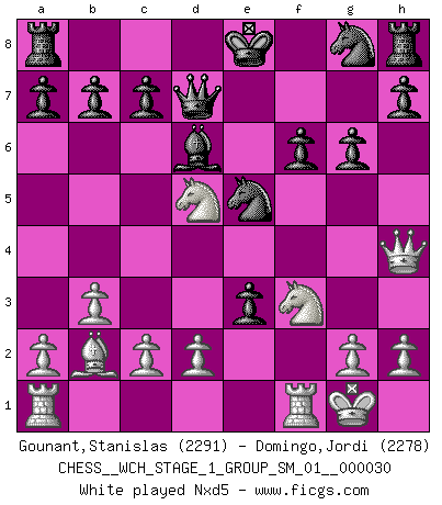 Last move : 1/2-1/2 2025 August 22 22:25:2 [Event "FICGS__CHESS__WCH_STAGE_1_GROUP_SM_01__000030"] [Site "FICGS"] [Date "2025.08.03"] [Round "1"] [White "Gounant,Stanislas"] [Black "Domingo,Jordi"] [Result "1/2-1/2"] [WhiteElo "2291"] [BlackElo "2278"] 1.b3 e5 2.Bb2 Nc6 3.e3 d5 4.Bb5 Bd6 5.f4 f6 6.Qh5+ g6 7.Qh4 exf4 8.Nf3 fxe3 9.O-O Bd7 10.Nc3 Ne5 11.Bxd7+ Qxd7 12.Nxd5 e2 13.Rfe1 Nxf3+ 14.gxf3 Bc5+ 15.d4 Qxd5 16.dxc5 O-O-O 17.Rxe2 Qxf3 18.Qe4 Qxe4 19.Rxe4 h5 20.Rf1 g5 21.Bxf6 1/2-1/2 Follow this game move after move (download)Chess is a more highly symbolic game, but the aggressions are therefore even more frankly represented in the play. It probably began as a war game; that is, the representation of a miniature battle between the forces of two kingdoms. (Karl Meninger) Früher wurde jeder komplizierte Zug, jedes interessante Opfer mit großem Beifall und Enthusiasmus aufgenommen. Heute schaltet man einfach seinen Fritz an, und man kann sehen, was los ist, ob der Zug geht oder nicht. (Vladimir Kramnik) Las leyes del Ajedrez no permiten una libre elección: tienes que mover quieras o no. (Emanuel Lasker) Les Echecs sont et restent toujours un combat, un combat intégral comme la boxe, la lutte ou un autre sport, et où il doit y avoir un vainqueur et un vaincu. (Joseph Emil Diemer) 98% of all statistics are made up. (Author unknown)