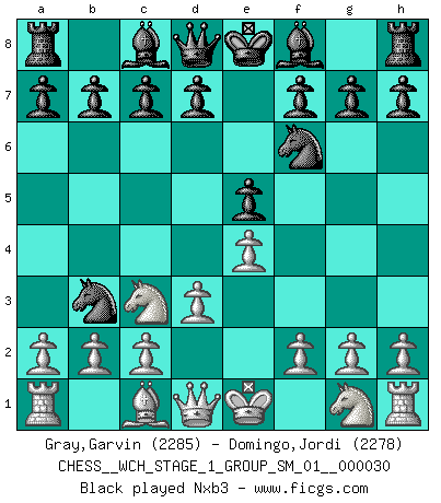 Last move : 1/2-1/2 2025 October 21 13:36:57 [Event "FICGS__CHESS__WCH_STAGE_1_GROUP_SM_01__000030"] [Site "FICGS"] [Date "2025.08.03"] [Round "1"] [White "Gray,Garvin"] [Black "Domingo,Jordi"] [Result "1/2-1/2"] [WhiteElo "2285"] [BlackElo "2278"] 1.e4 e5 2.Nc3 Nc6 3.Bc4 Nf6 4.d3 Na5 5.Bb3 Nxb3 6.axb3 d5 7.Nf3 dxe4 8.Nxe5 Bd6 9.Nc4 Bb4 10.Qe2 O-O 11.dxe4 b5 12.Nd2 a6 13.O-O Bb7 14.Rd1 Qe7 15.f3 Bc5+ 16.Kh1 Nh5 17.Nf1 f5 18.exf5 Qxe2 19.Nxe2 Rxf5 20.Nd4 Re5 21.c3 Rae8 22.b4 Bb6 23.Bd2 g5 24.h3 h6 25.Rac1 Kf7 26.Be1 Kg6 27.Bf2 Nf4 28.Rc2 h5 29.h4 g4 30.Kh2 gxf3 31.gxf3 1/2-1/2 Follow this game move after move (download)I give 98 percent of my mental energy to Chess. Others give only 2 percent. (Bobby Fischer) Alles was am Schachbrett zählt sind gute Züge. (Robert James Fischer) Tu no necesitas jugar muy bien, únicamente ayudar a tu oponenet a que juegue muy mal. (Genrikh Chepukaitis) Les Echecs mettent en conflit, non pas deux intelligences, mais deux volontés. (Lasker) If we knew what we were doing, we would not call it research. (Albert Einstein)