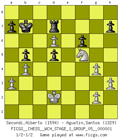 Last move : 1/2-1/2 2006 September 25 21:18:36 [Event "FICGS__CHESS__WCH_STAGE_1_GROUP_05__000001"] [Site "FICGS"] [Date "2006.07.01"] [Round "1"] [White "Secondi,Alberto"] [Black "Agustin,Santos"] [Result "1/2-1/2"] [WhiteElo "1594"] [BlackElo "1329"] 1.d4 Nf6 2.c4 e6 3.Nc3 Bb4 4.Nf3 d5 5.cxd5 Nxd5 6.Qc2 Nc6 7.e3 Bd7 8.Bd2 Qe7 9.Bd3 O-O-O 10.O-O f6 11.Nxd5 exd5 12.a3 Bxd2 13.Qxd2 Bg4 14.Nh4 g5 15.Bf5+ Bxf5 16.Nxf5 Qe4 17.Nh6 Rd7 18.f3 Qh4 19.Nf5 Qh5 20.b4 g4 21.Ng3 Qg6 22.fxg4 Re7 23.Rf5 Qf7 24.Raf1 Re6 25.Rxd5 Rd8 26.Rxd8+ Kxd8 27.d5 Rd6 28.e4 Ne5 29.h3 c6 30.Nf5 Rd7 31.d6 Qc4 32.Rc1 Qxe4 33.Re1 Qd5 34.Qxd5 cxd5 35.Kf2 Nd3+ 36.Ke2 Nxe1 37.Kxe1 b5 38.Kd2 Kc8 39.Ne7+ Kb7 40.Nf5 1/2-1/2 Nimzo-Indian : Three knights variation Queenside Castling by player Black (move 9) Kingside Castling by player White (move 10) This chess game ended in a draw. Follow this game move after move (download)The boy (then a 12 year old boy named Anatoly Karpov) doesn't have a clue about Chess, and there's no future at all for him in this profession. (Mikhail Botvinnik) Ihnen, Herr Lasker, habe ich nur drei Worte zu sagen: Schach und matt. (Siegbert Tarrasch) El sobresalir en el Ajedrez es un signo de una mente intrigante. (Sir Arthur Conan Doyle) Toutes choses étant égales, c'est la conviction qui gagne. Alliée à une volonté de vaincre, elle sert de détonateur, suscite des idées, disperse les doutes et aide à penser clairement. (Robert Fischer) The Internet is the world's largest library. It's just that all the books are on the floor. (John Allen Paulos)