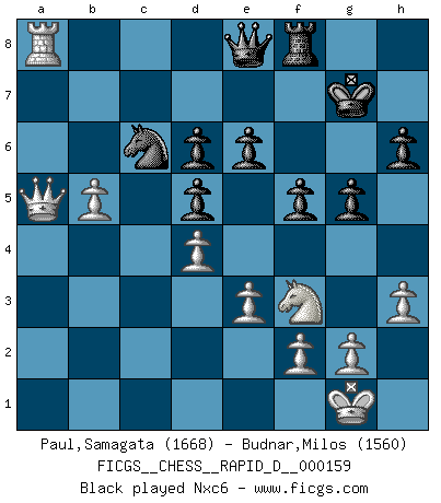 Last move : 1-0 2025 August 15 20:22:27 [Event "FICGS__CHESS__RAPID_D__000159"] [Site "FICGS"] [Date "2025.08.03"] [Round "1"] [White "Paul,Samagata"] [Black "Budnar,Milos"] [Result "1-0"] [WhiteElo "1668"] [BlackElo "1560"] 1.d4 h6 2.c4 e6 3.a3 Nf6 4.Nc3 Be7 5.Bf4 O-O 6.Nf3 d6 7.h3 d5 8.c5 Nc6 9.e3 Ne4 10.Qc2 a6 11.Bd3 f5 12.O-O Nxc3 13.Qxc3 b6 14.b4 b5 15.a4 bxa4 16.Rxa4 Bb7 17.Rfa1 g5 18.Bg3 Kg7 19.Bxa6 Bxa6 20.Rxa6 Rxa6 21.Rxa6 Qd7 22.b5 Nb8 23.c6 Qe8 24.Ra8 Bd6 25.Bxd6 cxd6 26.Qa5 Nxc6 27.Rxe8 Nxa5 28.Rxe6 Rf6 29.Re7+ Rf7 30.Re8 Rb7 31.Rd8 Nc4 32.Kh2 Rxb5 33.Ne1 g4 34.hxg4 fxg4 35.Kg3 h5 36.Nd3 Rb7 37.Nf4 1-0 Follow this game move after move (download)In complicated positions, Bobby Fischer hardly had to be afraid of anybody. (Paul Keres) Je mehr ich von der FIDE weiss, um so weniger verstehe ich. (Alexander Kalifman) Mi estilo es algo parecido entre un poco de Tal y Petrosian. (Reshevsky) Le plus grand jeu de l'esprit jamais inventé, plus vous l'apprenez, plus vous y prenez du plaisir. (Garry Kasparov) If you are good, you will be assigned all the work. If you are really good, you will get out of it. (Dan Rotaru)