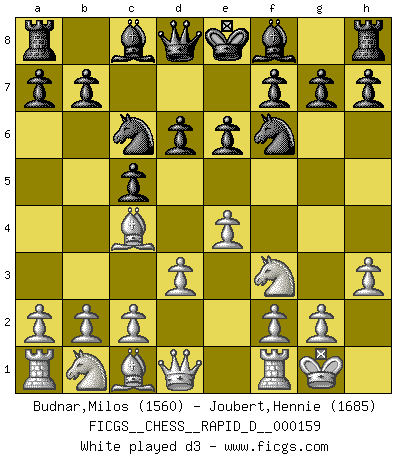 Last move : 1/2-1/2 2025 October 28 9:21:31 [Event "FICGS__CHESS__RAPID_D__000159"] [Site "FICGS"] [Date "2025.08.03"] [Round "1"] [White "Budnar,Milos"] [Black "Joubert,Hennie"] [Result "1/2-1/2"] [WhiteElo "1560"] [BlackElo "1685"] 1.e4 c5 2.Bc4 Nc6 3.Nf3 d6 4.h3 e6 5.O-O Nf6 6.d3 Be7 7.Bg5 h6 8.Bxf6 Bxf6 9.c3 O-O 10.Bb5 Bd7 11.Bc4 a6 12.a3 b5 13.Bb3 Rc8 14.a4 b4 15.Bc4 a5 16.Bb5 Qb6 17.Nbd2 bxc3 18.bxc3 Bxc3 19.Rb1 Bb4 20.Nc4 Qb7 21.Nxd6 Qc7 22.Nxc8 Qxc8 23.Qc2 Nd4 24.Nxd4 cxd4 25.Qxc8 Rxc8 26.Bxd7 Rc3 27.Rfd1 e5 28.Bb5 Kf8 29.Rbc1 Ke7 30.Rxc3 Bxc3 31.f3 Kd6 32.Kf2 f6 33.g4 Kc5 34.h4 Kb4 35.h5 Kc5 36.Rb1 Bb4 37.Bc4 Kb6 38.Bb5 Kc5 39.Rc1 Bc3 40.Rc2 Kb4 41.Rc1 Kc5 42.Rb1 Bb4 1/2-1/2 Follow this game move after move (download)I prefer to lose a really good game than to win a bad one. (David Levy) Alle Schachspieler sollten auch ein Hobby haben. (Savielly Grigorievitsch Tartakower) El hombre es un frívolo, una creatura engañosa y como un jugador de Ajedrez, se preocupa mas por el proceso de obtener su meta que de la meta por sí misma. (Dostoyevsky) Si je n'étais pas joueur d'échecs, je serais le meilleur dans quelque chose d'autre. (Anatoli Karpov) Art disturbs, science reassures. (Georges Braque, Le Jour et la Nuit)