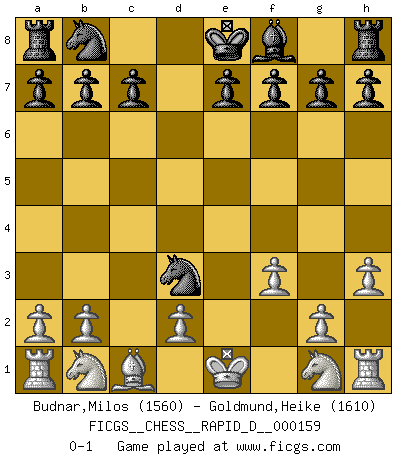 Last move : 0-1 2025 August 12 7:15:16 [Event "FICGS__CHESS__RAPID_D__000159"] [Site "FICGS"] [Date "2025.08.03"] [Round "1"] [White "Budnar,Milos"] [Black "Goldmund,Heike"] [Result "0-1"] [WhiteElo "1560"] [BlackElo "1610"] 1.e4 d5 2.exd5 Qxd5 3.Qf3 Nf6 4.h3 Bf5 5.Qxd5 Nxd5 6.Bd3 Bxd3 7.cxd3 Nf4 8.f3 Nxd3+ 0-1 Follow this game move after move (download)Bobby is the most misunderstood, misquoted celebrity walking the face of this earth. (Yasser Seirawan) Am wohlsten fühle ich mich, wenn ich sehe, wie sich mein Gegner im Todeskampf windet. (Robert James Fischer) El muchacho (en ese entonces un niño de 12 años llamado Anatoly Karpov) no tiene ni idea de lo que es el Ajedrez y no hay futuro en absoluto para el en esta profesión. (Mikhail Botvinnik) Les réformistes prétendent que les progrès de la théorie conduiront à la disparition des échecs, et qu'il faut, pour leur rendre vie, en remanier les règles. En réalité, qu'exprime cette affirmation? Le mépris de l'intuition, de l'imagination et de tous les autres éléments qui font des échecs un art. (Alexander Alekhine) Heh, heh, heh. Time to abandon ship. (General Grievous in Star Wars ep.3)