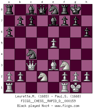 Last move : 1-0 2025 August 25 9:9:37 [Event "FICGS__CHESS__RAPID_D__000159"] [Site "FICGS"] [Date "2025.08.03"] [Round "1"] [White "Leurette,Marc-Antoine"] [Black "Paul,Samagata"] [Result "1-0"] [WhiteElo "1683"] [BlackElo "1668"] 1.e4 e5 2.Nf3 Nc6 3.Bc4 h6 4.c3 a6 5.d4 exd4 6.cxd4 d6 7.Be3 Nf6 8.Nbd2 Be7 9.Qb3 O-O 10.e5 dxe5 11.dxe5 Ne8 12.O-O Na5 13.Qc3 Nxc4 14.Nxc4 Be6 15.Rad1 Qc8 16.b3 b6 17.Qd3 c5 18.Nxb6 Qc6 19.Nxa8 Qxa8 20.Bc1 Nc7 21.Bb2 Nd5 22.a3 Rd8 23.Qb1 Qb8 24.Ba1 Rc8 25.b4 cxb4 26.Rc1 bxa3 27.Rxc8+ Qxc8 28.Rc1 Qd7 29.Nd4 Bg5 30.Rc6 g6 31.Rxa6 Qe7 32.Nxe6 fxe6 33.Qxg6+ 1-0 Follow this game move after move (download)The only thing Chess players have in common is Chess. (Lodewijk Prins) Es ist nicht das erste mal, dass sich die FIDE dem Arabischen Geld gebeugt hat (über die FIDE WM 2004 in Lybien). (Larry Evans) Por la belleza de sus partidas, la claridad de su juego y lo brillante de sus ideas, Fischer se creó el mismo como un artista de la misma estatura como Brahms, Rembrandt y Shakespeare. (David Levy) Les sacrifices démontrent seulement que quelqu'un a gaffé. (Savielly Tartacover) Life is pleasant. Death is peaceful. It's the transition that's troublesome. (Isaac Asimov)