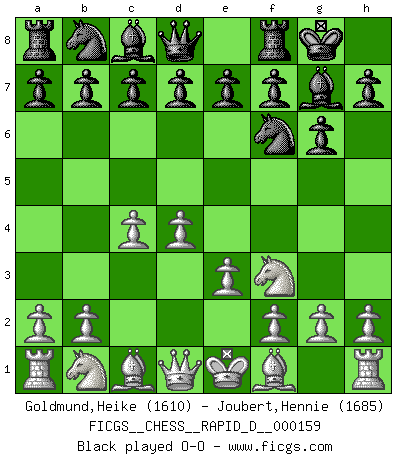 Last move : 0-1 2025 October 27 10:42:26 [Event "FICGS__CHESS__RAPID_D__000159"] [Site "FICGS"] [Date "2025.08.03"] [Round "1"] [White "Goldmund,Heike"] [Black "Joubert,Hennie"] [Result "0-1"] [WhiteElo "1610"] [BlackElo "1685"] 1.c4 Nf6 2.d4 g6 3.Nf3 Bg7 4.e3 O-O 5.Bd3 d6 6.b3 Nbd7 7.O-O e5 8.Bb2 e4 9.Bxe4 Nxe4 10.Nbd2 Nxd2 11.Qxd2 Nf6 12.d5 Ne4 13.Qc2 Bxb2 14.Qxb2 Bg4 15.Qc2 Re8 0-1 This chess game has been lost on time (started : 2025.08.03 12:27:22) Follow this game move after move (download)I like the moment when I break a man's ego. (Bobby Fischer) Unter Putin wird alles Geld aus Russland wie von einem Staubsauger nach Moskau umgeleitet, das ist wie ein schwarzes Loch. (Garry Kasparov) Juega la Apertura como un libro, el Juego Medio como un mago y los Finales como una máquina. (Spielmann) Avec des compensations pour le matériel en plus... (Anonyme) You have to believe in yourself. (Sun Tzu)