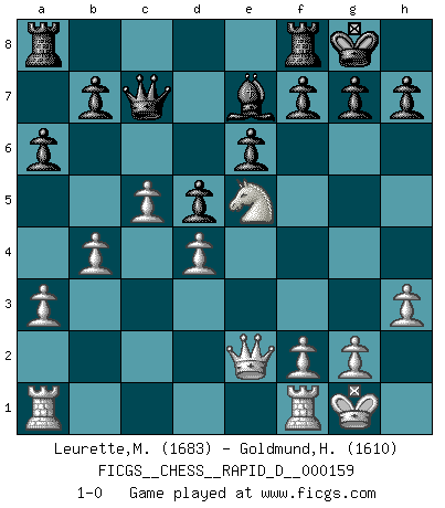 Last move : 1-0 2025 September 27 9:1:58 [Event "FICGS__CHESS__RAPID_D__000159"] [Site "FICGS"] [Date "2025.08.03"] [Round "1"] [White "Leurette,Marc-Antoine"] [Black "Goldmund,Heike"] [Result "1-0"] [WhiteElo "1683"] [BlackElo "1610"] 1.e4 d5 2.exd5 Qxd5 3.Nc3 Qa5 4.d4 Nf6 5.Bd2 c6 6.Nf3 Bg4 7.Be2 Nbd7 8.O-O e6 9.a3 Qc7 10.Bg5 Be7 11.Bxf6 Nxf6 12.h3 Bh5 13.Ne5 Bxe2 14.Qxe2 O-O 15.b4 Nd5 16.Nxd5 cxd5 17.c4 a6 18.c5 1-0 This chess game has been lost on time (started : 2025.08.03 12:27:22) Follow this game move after move (download)Human affairs are like a Chess game: only those who do not take it seriously can be called good players. (Hung Tzu Ch'eng) Ein Isolani verdüstert die Stimmung auf dem ganzen Schachbrett. (Savielly Grigorievitsch Tartakower) Haz el enroque temprano y seguido. (Rob Sillars) A ce moment-là, je menaçais de comprendre la position ! (Clément L'Heureux) Whoever said the pen is mightier than the sword obviously never encountered automatic weapons. (US General Douglas MacArthur)