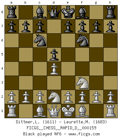 Last move : 0-1 2025 September 25 4:0:27 [Event "FICGS__CHESS__RAPID_D__000159"] [Site "FICGS"] [Date "2025.08.03"] [Round "1"] [White "Dittmer,Lutz"] [Black "Leurette,Marc-Antoine"] [Result "0-1"] [WhiteElo "1611"] [BlackElo "1683"] 1.d4 d5 2.Nd2 Nc6 3.Ngf3 Nf6 4.e3 e6 5.Bd3 g6 6.O-O Bg7 7.Re1 O-O 8.b3 b6 9.c4 a5 10.Bb2 Nb4 11.Ba3 Re8 12.Ng5 Nxd3 13.Re2 Ba6 0-1 This chess game has been lost on time (started : 2025.08.03 12:27:22) Follow this game move after move (download)A strong memory, concentration, imagination, and a strong will is required to become a great Chess player. (Bobby Fischer) Frage: Was machen Sie mit den Preisen? Anwort: Ich habe Angst, dass meine Freundin davon neue Kleider kauft. (Loek van Wely) Bobby es el jugador de Ajedrez mas fino que este país jamás haya producido. Su memoria para las movidas, su brillantez en soñar combinaciones y su feróz determinación por la victoria son algo extraño. (John Collins) Les erreurs sont comme les malheurs, elles n'arrivent jamais seules. (Siegbert Tarrasch) Don't be irreplaceable, if you can't be replaced, you can't be promoted. (Dan Rotaru)