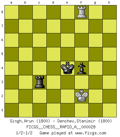Last move : 1/2-1/2 2007 October 24 11:24:59 [Event "FICGS__CHESS__RAPID_A__000028"] [Site "FICGS"] [Date "2007.10.06"] [Round "1"] [White "Singh,Arun"] [Black "Denchev,Stanimir"] [Result "1/2-1/2"] [WhiteElo "1800"] [BlackElo "1800"] 1.e4 d6 2.Nf3 e5 3.Bc4 Be7 4.h3 Nf6 5.d4 Nxe4 6.dxe5 dxe5 7.Qxd8+ Bxd8 8.Nxe5 O-O 9.O-O Bf6 10.Re1 Nd6 11.Bb3 Bxe5 12.Rxe5 Nc6 13.Re1 Bf5 14.Bf4 Nd4 15.c3 Nxb3 16.axb3 Rfe8 17.Nd2 Rxe1+ 18.Rxe1 Re8 19.Ra1 a6 20.Bxd6 cxd6 21.Nc4 d5 22.Nd6 Re5 23.Nxf5 Rxf5 24.Rd1 Kf8 25.g4 Re5 26.f4 Re2 27.Rxd5 Rxb2 28.b4 Rc2 29.Rc5 Ke7 30.Rc7+ Kf6 31.Rxb7 Rxc3 32.Rb6+ Ke7 33.Rxa6 Rxh3 34.Kf2 Rb3 35.Rb6 f6 36.b5 g6 37.Rb8 h5 38.gxh5 gxh5 39.b6 Ke6 40.b7 Kf5 41.Rh8 Rxb7 42.Rxh5+ Kxf4 43.Rh4+ Kg5 44.Ra4 Rb3 45.Rc4 f5 46.Ra4 f4 47.Ra8 Rc3 48.Rg8+ Kf5 49.Rf8+ Ke4 1/2-1/2 King's pawn Opening Kingside Castling by player Black (move 8) Kingside Castling by player White (move 9) 10 pieces endgame at move 33 : White KRPPP , Black KRPPP WHITE : King + 1 Rook 3 Pawns BLACK : King + 1 Rook 3 Pawns 9 pieces endgame at move 38 : White KRPPP , Black KRPP WHITE : King + 1 Rook 3 Pawns BLACK : King + 1 Rook 2 Pawns 8 pieces endgame at move 38 : White KRPP , Black KRPP WHITE : King + 1 Rook 2 Pawns BLACK : King + 1 Rook 2 Pawns 7 pieces endgame at move 41 : White KRP , Black KRPP WHITE : King + 1 Rook 1 Pawn BLACK : King + 1 Rook 2 Pawns 6 pieces endgame at move 42 : White KRP , Black KRP WHITE : King + 1 Rook 1 Pawn BLACK : King + 1 Rook 1 Pawn 5 pieces endgame at move 42 : White KR , Black KRP WHITE : King + 1 Rook BLACK : King + 1 Rook 1 Pawn This chess game ended in a draw. Follow this game move after move (download)There is only one thing Fischer does in Chess without pleasure: to lose ! (Boris Spassky) Zu meiner Zeit war ein 20 jähriger ein junger Spieler, heute ist er ein Veteran. (Garry Kasparov) Aquel que ve no otra dirección en el juego que la de dar Jaque Mate a su oponente, nunca será un buen jugador de Ajedrez. (Euwe) Votre seul travail dans les ouvertures est d'obtenir un milieu de partie jouable. (Lajos Portish) Mac users swear by their computers. PC users swear at their computers. (Author unknown)