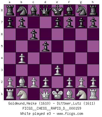 Last move : 1-0 2025 September 26 18:13:52 [Event "FICGS__CHESS__RAPID_D__000159"] [Site "FICGS"] [Date "2025.08.03"] [Round "1"] [White "Goldmund,Heike"] [Black "Dittmer,Lutz"] [Result "1-0"] [WhiteElo "1610"] [BlackElo "1611"] 1.b4 d5 2.Bb2 c6 3.e3 Bf5 4.c4 e6 5.Nf3 Bd6 6.Bxg7 Ne7 7.Bxh8 Kd7 8.Bf6 1-0 This chess game has been lost on time (started : 2025.08.03 12:27:22) Follow this game move after move (download)You can only get good at Chess if you love the game. (Bobby Fischer) Heutzutage gewinnt im Turnier nicht derjenige Spieler, der weitreichende Pläne entwirft, sondern einfach jener, der Zug um Zug kämpft. (David Bronstein) Fischer es el jugador mas fuerte del mundo. De hecho, el jugador mas fuerte que jamas haya existido. (Larry Evans) Echiquier : carré parfait, comme la Jérusalem nouvelle décrite par l'auteur de l'Apocalypse, huit cases sur huit, exaltation du chiffre 4, symbole du cosmos aux quatre horizons... où le noir et le blanc, l'ombre et la lumière, le mal et le bien s'entremêlent et se conjuguent. (Robert Couffignal, Le Gambit du poète) Inventor: A person who makes an ingenious arrangement of wheels, levers and springs, and believes it civilization. (Ambrose Bierce, The Devil's Dictionary)