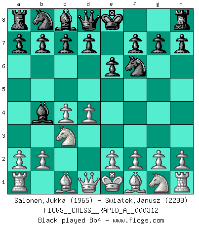 Last move : 0-1 2025 November 27 2:7:12 [Event "FICGS__CHESS__RAPID_A__000312"] [Site "FICGS"] [Date "2025.08.04"] [Round "1"] [White "Salonen,Jukka"] [Black "Swiatek,Janusz"] [Result "0-1"] [WhiteElo "1965"] [BlackElo "2288"] 1.d4 Nf6 2.c4 e6 3.Nc3 Bb4 4.e3 O-O 5.Nf3 c5 6.Bd3 d5 7.cxd5 exd5 8.dxc5 Nbd7 9.Bd2 Nxc5 10.Be2 Ne6 11.O-O a6 12.Rc1 Re8 13.Bd3 Bd6 14.Ne2 Ne4 15.Ng3 N6c5 16.Bb1 b6 17.Bc3 Nxc3 18.Rxc3 Bb7 19.a3 g6 20.Ba2 a5 21.Rc2 a4 22.Rd2 Qf6 23.Bxd5 Bxd5 24.Rxd5 Bxg3 25.Qd4 Bxf2+ 26.Rxf2 Qe6 0-1 This chess game has been lost on time (started : 2025.08.04 17:57:27) Follow this game move after move (download)Some sacrifices are sound; the rest are mine. (Mikhail Tal) Im Hotelzimmer gab es nur zwei Schaben. (Über die Turnierbedingungen) (Peter Swidler) Cuando la partida de Ajedrez termina, el Peón y el Rey regresan a la misma caja. (Irish saying) Les ravages du H expliquent la différence de niveau entre Tal et Thal [Abergel]. The difference between perseverance and obstinacy is that one comes from a strong will, and the other from a strong won't. (Henry Ward Beecher)