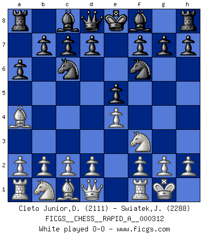 Last move : 1/2-1/2 2025 October 27 23:56:24 [Event "FICGS__CHESS__RAPID_A__000312"] [Site "FICGS"] [Date "2025.08.04"] [Round "1"] [White "Cleto Junior,Dirceu"] [Black "Swiatek,Janusz"] [Result "1/2-1/2"] [WhiteElo "2111"] [BlackElo "2288"] 1.e4 e5 2.Nf3 Nc6 3.Bb5 a6 4.Ba4 Nf6 5.O-O Nxe4 6.c3 Nc5 7.Bc2 e4 8.b4 Ne6 9.Bxe4 d5 10.Bc2 d4 11.Be4 Be7 12.Qc2 O-O 13.Re1 h6 14.Na3 Nf4 15.Nxd4 Nxd4 16.cxd4 Bf6 17.Rb1 Bxd4 18.d3 Nd5 19.Nc4 Re8 20.a3 Nc3 21.Rb3 Nb5 22.a4 Nd6 23.Be3 Nf5 24.R3b1 c6 25.Bf4 Ba7 26.Qd2 Nd4 27.Be5 Re7 28.h3 Be6 29.Nd6 Rd7 30.Qf4 Bb8 31.Qg3 Qf8 32.Bxd4 Bxd6 33.Be5 Bxe5 34.Qxe5 Rad8 35.Qa5 Ba2 36.Rbc1 Bd5 1/2-1/2 Follow this game move after move (download)Discovered check is the dive bomber of the Chessboard. (Reuben Fine) Ich verlor meine Bürgerrechte, mein Gehalt wurde mir nicht mehr bezahlt und ich wurde zensiert und durfte nicht mehr ins Ausland reisen. [nach dem Match Fischer-Taimanov 6:0] (Mark Taimanov) Yo considero que Fischer es uno de los expertos mas grandes de aperturas de siempre. (Keith Hayward) Ne tendez aucun piège pour le plaisir ! Ne jouez rien dans l'espoir que l'adversaire réagisse de façon stupide ! Prenez toujours pour acquis que l'adversaire va trouver le meilleur coup ! Ne jouez jamais de coup dans l'espoir que l'adversaire ne voie pas la menace ! Chacun de vos coups doit améliorer la position d'une façon ou d'une autre. If you are going through hell, keep going. (Winston Churchill)