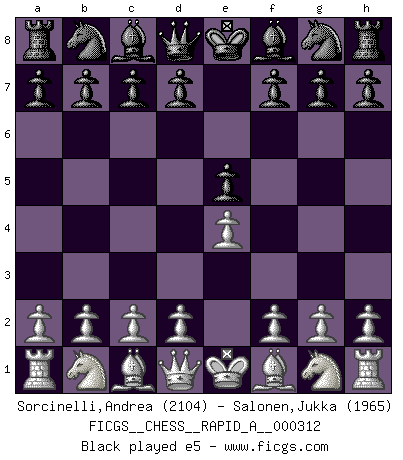 Last move : 1/2-1/2 2025 September 8 7:59:55 [Event "FICGS__CHESS__RAPID_A__000312"] [Site "FICGS"] [Date "2025.08.04"] [Round "1"] [White "Sorcinelli,Andrea"] [Black "Salonen,Jukka"] [Result "1/2-1/2"] [WhiteElo "2104"] [BlackElo "1965"] 1.e4 e5 2.Nf3 Nc6 3.Bb5 a6 4.Ba4 Nf6 5.O-O Be7 6.Re1 b5 7.Bb3 O-O 8.a4 b4 9.a5 d6 10.c3 Rb8 11.Bc4 Bg4 12.h3 Bh5 13.Bxa6 d5 14.exd5 Qxd5 15.d3 Bxf3 16.Qxf3 Qxf3 17.gxf3 bxc3 18.bxc3 Ra8 19.Bb7 Rxa5 20.Rxa5 Nxa5 21.Rxe5 Nxb7 22.Rxe7 Nc5 23.Rxc7 1/2-1/2 Follow this game move after move (download)It is the aim of the modern school, not to treat every position according to one general law, but according to the principle inherent in the position. (Richard Reti) Alles was ich jemals tun will ist Schach spielen. (Robert James Fischer) Por esta medida (el intervalo entre Fischer y sus contemporaneos), yo le considero el mas grande campeón mundial. (Garry Kasparov) Le système Elo représente seulement une moyenne. Il est simplement un indicateur de votre stabilité. (Anatoli Karpov) Secret operations are essential in war; upon them the army relies to make its every move. (Sun Tzu)