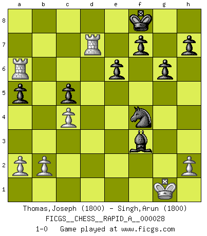 Last move : 1-0 2007 October 25 11:33:49 [Event "FICGS__CHESS__RAPID_A__000028"] [Site "FICGS"] [Date "2007.10.06"] [Round "1"] [White "Thomas,Joseph"] [Black "Singh,Arun"] [Result "1-0"] [WhiteElo "1800"] [BlackElo "1800"] 1.c4 Nf6 2.Nc3 e6 3.d4 d5 4.Nf3 c6 5.e3 Be7 6.Bd3 O-O 7.O-O Nbd7 8.e4 dxe4 9.Nxe4 Nxe4 10.Bxe4 Nf6 11.Bc2 b6 12.Qd3 Bb7 13.Bg5 g6 14.Rfe1 a6 15.Rad1 c5 16.d5 Nxd5 17.Bh6 Nf6 18.Qe3 Qc7 19.Bxf8 Rxf8 20.Ne5 Bd6 21.f4 Nh5 22.Rd2 Ba8 23.Red1 Qb7 24.Be4 Qxe4 25.Qxe4 Bxe4 26.Rxd6 Nxf4 27.Nd7 Bxg2 28.Nxf8 Kxf8 29.Rxb6 Bf3 30.Rd7 a5 31.Ra6 1-0 English Opening Kingside Castling by player Black (move 6) Kingside Castling by player White (move 7) Player White won this chess game. Follow this game move after move (download)Different people feel differently about resigning. (Bobby Fischer) Wie, soll nun auch die Opposition abgeschafft werden? Ja, es tut mir leid, Ihnen diesen Schmerz nicht ersparen zu können. (Aaron Nimzowitsch) No hay precio que sea tan grande por la cabellera del Rey enemigo. (Koblentz) Il s'avisa de me proposer d'apprendre les échecs qu'il jouait un peu... me voilà forcené des échecs. J'achète un échiquier, je m'enferme dans ma chambre, j'y passe des jours et des nuits à vouloir apprendre par cur toutes les parties. (Jean-Jacques Rousseau, Confessions) Whoever said the pen is mightier than the sword obviously never encountered automatic weapons. (US General Douglas MacArthur)