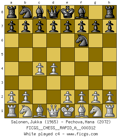 Last move : 0-1 2025 November 27 4:25:18 [Event "FICGS__CHESS__RAPID_A__000312"] [Site "FICGS"] [Date "2025.08.04"] [Round "1"] [White "Salonen,Jukka"] [Black "Pechova,Hana"] [Result "0-1"] [WhiteElo "1965"] [BlackElo "2072"] 1.d4 Nf6 2.c4 g6 3.Nc3 Bg7 4.e4 d6 5.Be2 O-O 6.Nf3 e5 7.Be3 exd4 8.Nxd4 Re8 9.f3 c6 10.Qd2 d5 11.exd5 cxd5 12.O-O Nc6 13.Rad1 Nxd4 14.Bxd4 dxc4 15.Bxc4 Be6 16.Bb5 Rf8 17.Rfe1 a6 18.Bf1 Rc8 19.Qf2 Qc7 20.g4 b5 21.Qh4 b4 22.Ne2 Nd5 0-1 This chess game has been lost on time (started : 2025.08.04 17:57:27) Follow this game move after move (download)The laws of Chess do not permit a free choice: you have to move whether you like it or not. (Emanuel Lasker) Taktik ist was man tun muß, wenn etwas zu tun ist. Strategie ist was man tun muß, wenn nichts zu tun ist. (Savielly Grigorievitsch Tartakower) Tu cuerpo tiene que estar en óptima condición. Tu Ajedrez se deteriora como lo hace tu cuerpo. No puedes separar la mente y el cuerpo. (Bobby Fischer) Les Echecs, c'est l'art de la guerre sans les charniers, c'est la résurrection des morts tombés au champ d'honneur, l'espoir perpétuel, la suprématie de l'intelligence sur la force, la culture de l'esprit. (F. Szpiner) Bobby never cared about money, though. His only desire was to prove that his choices were correct: He wanted chess to be important because he was a chess player, and he wanted to be important. Bobby knew money was important, but he didn't have a clue why, outside of clothes and status. The only way he could accomplish what he wanted was to fight for a lot of money. Once he got it, he gave it away. He did not know how to spend it. And once he'd become champion, after, essentially, sacrificing his life for it, he didn't know how to spend his time. (Bob Wade)