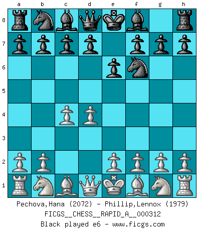Last move : 0-1 2025 October 10 16:2:51 [Event "FICGS__CHESS__RAPID_A__000312"] [Site "FICGS"] [Date "2025.08.04"] [Round "1"] [White "Pechova,Hana"] [Black "Phillip,Lennox"] [Result "0-1"] [WhiteElo "2072"] [BlackElo "1979"] 1.d4 Nf6 2.c4 e6 3.Nc3 Bb4 4.e3 O-O 5.Bd3 d5 6.Nf3 c5 7.O-O dxc4 8.Bxc4 Nc6 9.a3 Ba5 10.Qd3 a6 11.dxc5 Qxd3 12.Bxd3 Bxc3 13.bxc3 Na5 14.Rb1 Rd8 15.Ne5 Nd7 16.Nxd7 Bxd7 17.Rb4 Rdc8 18.c4 Rxc5 19.e4 b5 20.Be3 R5c8 21.cxb5 Rc3 22.Rd1 Bxb5 23.Bxb5 axb5 24.Rxb5 Rxa3 25.Rc5 Ra4 26.f3 Nc4 27.Rc1 Nd6 28.e5 Ne8 29.Rc8 h5 30.R1c6 Kh7 0-1 This chess game has been lost on time (started : 2025.08.04 17:57:27) Follow this game move after move (download)Fischer sacrificed virtually everything most of us weakies (to use his term) value, respect, and cherish, for the sake of an artful, often beautiful board game, for the ambivalent privilege of being its greatest master. (Paul Kollar) Mit sehr nachdenklichem Gesicht schreitet Bobby durch den Turniersaal. Was ist passiert?, fragt Lombardy. Ich stehe schlecht, antwortet Fischer. Lombardy: Dann biete doch einfach Remis an. Fischer: So schlecht stehe ich nun auch wieder nicht! (Robert James Fischer) La táctica fluye a partir de una posición superior. (Bobby Fischer) La vie est comme un jeu d'échecs : nous esquissons un plan, mais celui-ci est tributaire de ce que daignent faire l'adversaire aux échecs et le destin dans la vie. (Arthur Schopenhauer) The best weapon against an enemy is another enemy. (Friedrich Nietzsche)