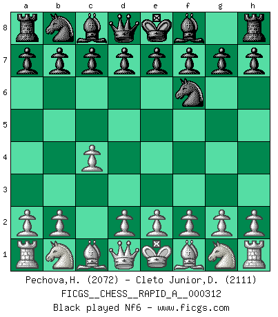 Last move : 1-0 2025 September 29 1:23:28 [Event "FICGS__CHESS__RAPID_A__000312"] [Site "FICGS"] [Date "2025.08.04"] [Round "1"] [White "Pechova,Hana"] [Black "Cleto Junior,Dirceu"] [Result "1-0"] [WhiteElo "2072"] [BlackElo "2111"] 1.c4 Nf6 2.Nc3 e5 3.Nf3 Nc6 4.g3 Bb4 5.Bg2 O-O 6.O-O e4 7.Ne1 Bxc3 8.dxc3 h6 9.Nc2 d6 10.Ne3 Re8 11.Qc2 a5 12.Bd2 a4 13.Rfe1 Bd7 14.Rad1 Ra5 15.Nd5 Nxd5 16.cxd5 Rxd5 17.Bxe4 Rde5 18.Bf3 Qf6 19.Be3 Ra5 20.Bd5 b6 21.Bd4 Qg5 22.Bg2 Qb5 23.c4 Nb4 24.Qc3 1-0 Follow this game move after move (download)The chessboard is the world, the pieces are the phenomena of the Universe, the rules of the game are what we call the laws of Nature and the player on the other side is hidden from us. (Thomas Huxley) Modernes Schach sorgt sich zuviel um Dinge wie Bauernstruktur usw. Vergessen Sie das, Schachmatt beendet das Spiel! (Nigel Short) Prefiero perder una partida realmente buena, que ganar una mala. (David Levy) Vous n'êtes pas toujours obligé de jouer le meilleur coup. Un coup doit être actif, entreprenant, correct et beau ! (David Bronstein) Wawaweewa ! (Borat: Cultural learnings of America for make benefit glorious nation of Kazakhstan)