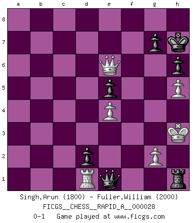 Last move : 0-1 2007 October 31 14:55:10 [Event "FICGS__CHESS__RAPID_A__000028"] [Site "FICGS"] [Date "2007.10.06"] [Round "1"] [White "Singh,Arun"] [Black "Fuller,William"] [Result "0-1"] [WhiteElo "1800"] [BlackElo "2000"] 1.e4 c5 2.Nf3 d6 3.c4 Nc6 4.Nc3 e5 5.d3 f5 6.Be2 Be7 7.Nd5 Nf6 8.O-O O-O 9.Bd2 fxe4 10.Nxf6+ Bxf6 11.dxe4 Be6 12.Qc2 Nd4 13.Nxd4 cxd4 14.Bd3 Rc8 15.b3 b5 16.Qb2 bxc4 17.Bxc4 Bxc4 18.bxc4 Bg5 19.f4 Bh6 20.fxe5 Rxf1+ 21.Rxf1 Bxd2 22.Qxd2 dxe5 23.Qd3 Qc7 24.Qb3 Qc5 25.Kh1 h6 26.h3 Qc6 27.Re1 a6 28.Kh2 Kh8 29.c5 Qxc5 30.Qe6 Rd8 31.Qxa6 d3 32.Rf1 d2 33.Qe2 Qa7 34.Ra1 Qa4 35.Rd1 Qxa2 36.h4 Qc2 37.h5 Kg8 38.Kh3 Qb3+ 39.Kh2 Qc3 40.Kh1 Qd3 41.Qg4 Qe3 42.Kh2 Qe1 43.Qe6+ Kh8 44.Qg4 Rf8 45.Kh3 Rf1 46.Qc8+ Kh7 47.Qe6 Rh1+ 0-1 Sicilian Kingside Castling by player White (move 8) Kingside Castling by player Black (move 8) Player Black won this chess game. Follow this game move after move (download)Many have become Chess Masters, no one has become the Master of Chess. (Siegbert Tarrasch) Ein Remis kann durch Wiederholung von drei Zügen oder durch einen schlechte Zug erreicht werden. (Savielly Grigorievitsch Tartakower) Bendita sea la memoria de aquel que dio al mundo este juego inmortal. (A. G. Gardiner) D'abord les bases : Jouez et étudiez, puis étudiez et jouez, ensuite jouez et étudiez, puis étudiez et jouez. Deuxièmement : Donnez toujours le meilleur de vous-même ! (Ken Smith) The problem with troubleshooting is that trouble shoots back. (Anonymous)