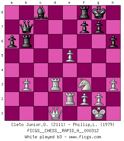 Last move : 1/2-1/2 2025 August 11 21:43:38 [Event "FICGS__CHESS__RAPID_A__000312"] [Site "FICGS"] [Date "2025.08.04"] [Round "1"] [White "Cleto Junior,Dirceu"] [Black "Phillip,Lennox"] [Result "1/2-1/2"] [WhiteElo "2111"] [BlackElo "1979"] 1.e4 e5 2.Nf3 Nc6 3.Bb5 a6 4.Ba4 Nf6 5.O-O Be7 6.Re1 b5 7.Bb3 d6 8.c3 Na5 9.Bc2 c5 10.d4 Qc7 11.a4 Ra7 12.Nbd2 cxd4 13.cxd4 O-O 14.h3 Nc6 15.Nb3 Nb4 16.Bb1 bxa4 17.Rxa4 Rb7 18.Bd2 d5 19.Bg5 h6 20.dxe5 Nxe4 21.Bxe7 Qxe7 22.Nbd4 Rb6 23.Ra3 Qc7 24.Bxe4 dxe4 25.Rxe4 Qb7 26.Re2 Nc6 27.Nxc6 Rxc6 28.Rd3 Rb6 29.b3 Bf5 30.Rde3 Be6 31.Nd4 Rb8 32.Nxe6 fxe6 33.Rb2 a5 34.Rg3 Rb5 35.Kh2 Rxe5 36.Qd6 Rd5 37.Qxe6+ Kh8 38.Ra2 Rf8 39.Qe1 Qc7 40.Re2 Qf4 41.Kg1 Rc5 42.Re8 Kh7 43.Re7 Rf7 44.Rxf7 Qxf7 45.Qe4+ Kg8 46.Rf3 Rc1+ 47.Kh2 Qc7+ 48.g3 Qc6 49.Qf4 1/2-1/2 Follow this game move after move (download)You know, comrade Pachman, I don't enjoy being a Minister, I would rather play Chess like you. (Che Guevara) Schach ist ein Teil der Kultur, und wenn es mit der Kultur abwärts geht, geht es auch mit dem Schach abwärts. (Mikhail Moiseyevich Botvinik) Yo no creo en la psicología. Yo creo en las buenas movidas. (Bobby Fischer) Vous m'avez demandé de vous exposer quel est le fondement de la prière. Je ne fais que préparer les pièces du jeu sur la table... Nous sera-t-il permis d'en adopter les règles et si nous les appliquons scrupuleusement nous ne tarderons pas à faire mat le Roi divin ! Il ne pourra échapper à nos mains. (Sainte Thérèse d'Avila, Chemin de perfection) A clear conscience is usually the sign of a bad memory. (Unknown)