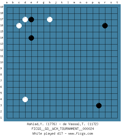 Last move : 1-0 2025 December 27 13:55:33 [Event "FICGS__GO__WCH_TOURNAMENT__000024"] [Site "FICGS"] [Date "2025.08.07"] [Round "1"] [Black "Aahlad,Yeturu"] [White "de Vassal,Thibault"] [Result "1-0"] [Rating 1 "1776"] [Rating 2 "1172"] 1.r16 c16 2.q3 d4 3.e17 h17 4.e14 d17 5.e16 e18 6.f18 d18 7.g17 k16 8.h18 n17 9.p17 j17 10.r6 c13 11.c15 b15 12.d16 b16 13.f3 e3 14.f4 c6 15.l4 e12 16.j18 k18 17.l17 l16 18.m17 m16 19.n18 n15 20.c14 b13 21.q10 f7 22.o17 n16 23.f6 g7 24.e6 e7 25.c5 d5 26.d6 c7 27.d7 d8 28.b5 b8 29.c3 g6 30.e4 g13 31.h14 g14 32.h15 g15 33.g16 h16 34.k17 j16 35.m18 n12 36.o14 n13 37.n14 m14 38.h4 n9 39.f12 f13 40.e13 d13 41.l10 m9 42.m13 j13 43.l14 m15 44.k13 j14 45.l9 l8 46.k8 l7 47.k7 k6 48.l6 j6 49.h12 j12 50.h13 g12 51.h11 l12 52.n11 f11 53.j11 k12 54.m10 1-0 Follow this game move after move (download)Learning josekis by heart is useless if you don't try departing from them. (Pierre Audouard) Nowadays, anyone who cannot speak English and is incapable of using the Internet is regarded as backward. (Al-Waleed bin Talal)