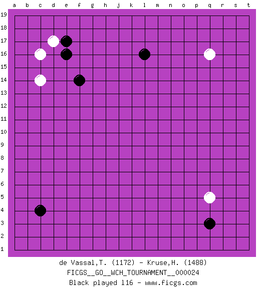 Last move : 0-1 2026 January 31 19:22:49 [Event "FICGS__GO__WCH_TOURNAMENT__000024"] [Site "FICGS"] [Date "2025.08.07"] [Round "1"] [Black "de Vassal,Thibault"] [White "Kruse,Herbert"] [Result "0-1"] [Rating 1 "1172"] [Rating 2 "1488"] 1.q3 q16 2.c4 c16 3.e17 d17 4.e16 c14 5.f14 q5 6.l16 p3 7.q4 p4 8.r5 r6 9.r4 q6 10.k3 p2 11.q2 s6 12.s2 t4 13.s3 e3 14.d3 e4 15.g3 j4 16.j3 d4 17.c2 c5 18.e2 f3 19.f2 g4 20.h4 b4 21.h5 c3 22.r10 r13 23.p10 n17 24.m17 n16 25.n10 n6 26.l6 o9 27.o10 l15 28.k15 l14 29.k14 k16 30.k17 j16 31.j17 h16 32.g18 k13 33.j14 l13 34.j13 j12 35.f13 h12 36.g14 m8 37.s12 r12 38.s11 s13 39.s8 q8 40.r11 p12 41.q9 r8 42.s9 d2 43.t10 g2 44.h3 d11 45.f11 m18 46.l18 m16 47.l17 e10 48.g5 n18 49.f6 e7 50.e6 k19 51.l19 h17 52.j18 h18 53.h19 j19 54.k18 j19 55.g19 f18 56.g17 g16 57.f17 m19 58.d18 c18 59.e18 d14 60.e15 g12 61.f12 e14 62.g15 g9 63.h15 h13 64.f19 d19 65.d16 c17 0-1 Follow this game move after move (download)If you lose by one point, take a rest. (Anonymous) Panic is a sudden desertion of us, an a going over to the enemy of our imagination. (Christian Nevell Bovee)