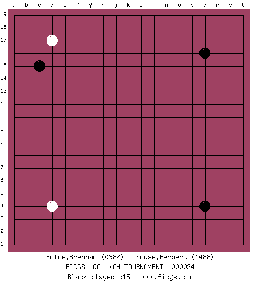 Last move : 0-1 2025 December 13 3:20:2 [Event "FICGS__GO__WCH_TOURNAMENT__000024"] [Site "FICGS"] [Date "2025.08.07"] [Round "1"] [Black "Price,Brennan"] [White "Kruse,Herbert"] [Result "0-1"] [Rating 1 "0982"] [Rating 2 "1488"] 1.q16 d4 2.q4 d17 3.c15 c16 4.d15 f17 5.f15 r17 6.r16 q17 7.p17 p18 8.o17 o18 9.n17 n18 10.r10 m17 11.m16 l16 12.n15 m15 13.n16 l15 14.d10 n14 15.o14 o13 16.p15 p14 17.o15 n13 18.q14 o3 19.r6 q3 20.r3 r2 21.s3 p4 22.q5 c7 23.c10 f3 24.j3 l3 25.j5 l5 26.k7 g6 27.l9 k12 28.g12 j6 29.k6 k5 30.h5 h6 31.g3 g4 32.h4 g2 33.h2 h3 34.q2 g3 35.p3 p2 36.q3 b9 37.b10 p13 38.q13 q12 39.r12 q11 40.r11 g16 41.g15 p9 42.q9 e8 43.f10 h15 44.h14 j15 45.j14 o2 46.p8 k14 47.j12 b16 48.b15 j11 49.h12 o8 50.p7 n6 51.o5 k10 52.e16 e17 53.k9 j9 54.p10 o9 55.o10 n10 56.q10 n9 57.p12 n5 58.p11 s16 59.s15 s17 60.q1 a15 61.a14 a16 62.b13 g9 63.g10 c8 64.h10 h9 65.l11 m11 66.l10 j10 67.k13 l13 68.j13 n12 69.c3 b4 70.b3 d2 71.c2 o4 72.p5 t15 73.k2 c4 74.d3 e2 0-1 Follow this game move after move (download)With only one group, you will win. (Anonymous) I find your interest interesting. (Gregory House, House M.D.)