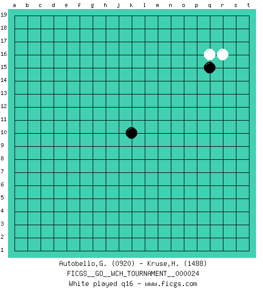 Last move : 0-1 2025 October 2 6:12:22 [Event "FICGS__GO__WCH_TOURNAMENT__000024"] [Site "FICGS"] [Date "2025.08.07"] [Round "1"] [Black "Autobello,Giovanni"] [White "Kruse,Herbert"] [Result "0-1"] [Rating 1 "0920"] [Rating 2 "1488"] 1.k10 r16 2.q15 q16 3.r15 p16 4.p15 o15 5.o16 n16 6.o17 n17 7.o18 n15 8.p17 q18 9.q17 r17 10.p18 r18 11.p19 q4 12.n18 m18 13.m19 l18 14.l19 d16 15.k18 n19 16.o19 q19 17.m17 n19 18.k19 r11 0-1 This go game has been lost on time (started : 2025.08.07 0:12:39) Follow this game move after move (download)One point in the center is worth ten in the corner. (Anonymous) The only thing that overcomes hard luck is hard work. (Harry Golden)