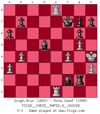 Last move : 0-1 2007 October 20 17:30:28 [Event "FICGS__CHESS__RAPID_A__000028"] [Site "FICGS"] [Date "2007.10.06"] [Round "1"] [White "Singh,Arun"] [Black "Riha,Josef"] [Result "0-1"] [WhiteElo "1800"] [BlackElo "1948"] 1.e4 e6 2.d4 d5 3.e5 c5 4.c3 Nc6 5.Nf3 Qb6 6.Bd3 Bd7 7.O-O cxd4 8.cxd4 Nxd4 9.Nxd4 Qxd4 10.Nc3 a6 11.Re1 Ne7 12.a3 Ng6 13.Be3 Qxe5 14.Bb6 Qd6 15.Bd4 Be7 16.b4 Rc8 17.Na4 e5 18.Bc5 Qe6 19.Nb6 Bxc5 20.Nxc8 Bf8 21.Qh5 Bxc8 22.Bxg6 fxg6 23.Qxe5 Qxe5 24.Rxe5+ Kf7 25.Rxd5 Be7 26.Re1 Bf5 27.h3 Rc8 28.g4 Be6 29.Rde5 Rc6 30.f4 Bf6 31.R5e4 Bd5 32.Re8 Rc3 33.g5 Rg3+ 34.Kf2 Rf3+ 35.Kg1 Bd4+ 36.Kh2 Rf2+ 37.Kg3 Rg2+ 38.Kh4 Bf2+ 0-1 French : Advance, Milner-Barry gambit Kingside Castling by player White (move 7) Player Black won this chess game. Follow this game move after move (download)Chess demands total concentration. (Bobby Fischer) Man braucht nicht immer den besten Zug zu spielen: Ein Zug muß aktiv, unternehmungslustig, korrekt und schön sein. (David Bronstein) El Ajedrez, como la música, como el amor, tiene el poder de hacer feliz a la gente. (Siegbert Tarrasch) Toutes les manuvres exécutées sur une colonne ouverte ont pour but ultime l'intrusion définitive sur la septième ou la huitième rangée, en plein cur de la position ennemie. (Aaron Nimzovitch) Thibault, I ask for draw. Game 13876. - Sorry Ilmars, you won. (FICGS chat)