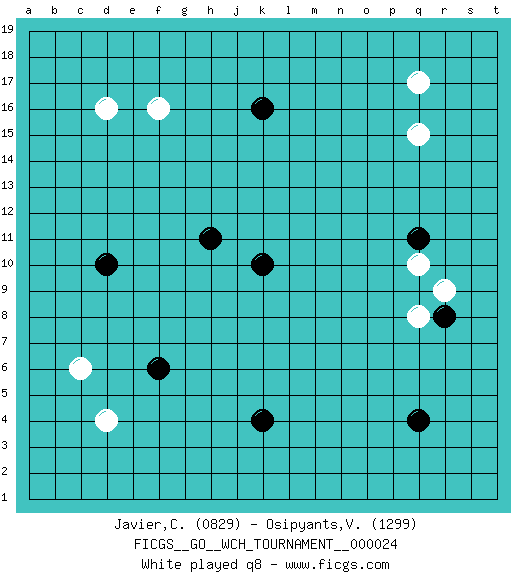 Last move : pass 2026 February 9 16:28:56 Player 1 - 18 days 14:32:19 Player 2 - 100 days 00:00:00 [Event "FICGS__GO__WCH_TOURNAMENT__000024"] [Site "FICGS"] [Date "2025.08.07"] [Round "1"] [Black "Javier,Christian"] [White "Osipyants,Vladimir"] [Result "*"] [Rating 1 "0829"] [Rating 2 "1299"] 1.q4 d4 2.k10 q17 3.d10 d16 4.k16 q15 5.k4 q10 6.h11 f16 7.r8 r9 8.f6 c6 9.q11 q8 10.p10 r11 11.p12 q13 12.o9 r7 13.p8 p7 14.q6 s8 15.o11 q7 16.q9 r10 17.r12 q12 18.q14 r14 19.n10 p6 20.o7 q5 21.o6 p4 22.r5 r6 23.o5 q3 24.p14 r13 25.p13 c13 26.r3 r4 27.s4 s5 28.o4 o3 29.n4 g4 30.n3 j5 31.n2 o2 32.p15 p16 33.n8 j7 34.o13 m16 35.o16 o17 36.n15 m15 37.n14 l14 38.m14 k15 39.n12 h14 40.m13 k12 41.k11 l6 42.m11 f12 43.l12 k13 44.l10 f9 45.j12 f11 46.h6 j6 47.q2 r2 48.s3 p2 49.d11 d8 50.c8 c9 51.j9 h8 52.h16 l8 53.m7 l7 54.m9 j4 55.s11 s12 56.s13 s14 57.n17 m17 58.l5 k5 59.k3 j3 60.m18 n18 61.l17 l18 62.m19 n19 63.l4 j2 64.k2 k1 65.l2 n1 66.m1 o1 67.j8 h7 68.g7 g9 69.r16 q16 70.h9 g8 71.e7 d9 72.g5 f4 73.k17 g17 74.g13 f14 75.g11 g10 76.g15 g14 77.h13 j13 78.h15 f15 79.e13 f13 80.e12 d14 81.j15 j14 82.d6 c5 83.k9 m6 84.m5 n6 85.f8 e8 86.s7 n16 87.e3 d3 88.s9 s10 89.p18 o15 90.e14 e15 91.f3 g3 92.t6 t5 93.t4 s2 94.t2 t3 95.e5 e4 96.e10 e9 97.t8 t9 98.g2 d2 99.d12 b10 100.h1 j1 101.h17 h18 102.r1 k8 103.s1 pass 104.s3 q1 105.t4 pass 106.c3 c4 107.c7 d7 108.t12 t13 109.s15 r17 110.r18 s17 111.h3 h4 112.h5 f5 113.t10 t11 114.e1 e2 115.f2 h2 116.t16 t17 117.t14 pass 118.c12 h10 119.f10 g12 120.s18 q18 121.m3 l1 122.l15 l16 123.o18 pass 124.q19 pass 125.j18 g18 126.a9 b9 127.c10 b13 128.b11 j10 129.k18 l19 130.j19 pass 131.* Follow this game move after move (download)You have to like to win, and to learn to recognize the errors that gave you the victory. (Pierre Audouard) Wikichess, chess moves explained by 'experimented' players. (Thibault de Vassal)