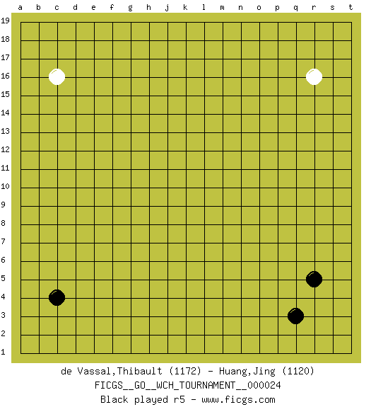 Last move : p10 2026 February 10 17:53:29 Player 1 - 16 days 06:54:35 Player 2 - 8 days 10:12:59 [Event "FICGS__GO__WCH_TOURNAMENT__000024"] [Site "FICGS"] [Date "2025.08.07"] [Round "1"] [Black "de Vassal,Thibault"] [White "Huang,Jing"] [Result "*"] [Rating 1 "1172"] [Rating 2 "1120"] 1.q3 r16 2.c4 c16 3.r5 e4 4.e3 f3 5.d3 g4 6.d7 l3 7.c12 f16 8.e12 q10 9.p16 n16 10.p14 r14 11.p12 r12 12.o11 k17 13.o9 o3 14.g7 r7 15.h13 k13 16.m14 k15 17.j12 j7 18.j8 k8 19.j9 h7 20.h8 g6 21.f7 k9 22.l12 k12 23.l11 j10 24.h10 g8 25.h9 h11 26.j11 k10 27.g11 k11 28.o7 e6 29.e7 c5 30.b4 c6 31.c7 q2 32.p2 r3 33.r2 q4 34.p3 r4 35.s2 p4 36.n6 o2 37.q1 o5 38.l7 k7 39.l6 k5 40.l10 b13 41.c13 b14 42.b12 q17 43.p17 n18 44.d15 d16 45.e15 e16 46.f15 g15 47.g14 h15 48.q8 r8 49.q9 r9 50.p10 * Follow this game move after move (download)Go uses the most elemental materials and concepts - line and circle, wood and stone, black and white - combining them with simple rules to generate subtle strategies and complex tactics that stagger the imagination. (Iwamoto Kaoru, 9 dan professional Go player and former Honinbo title holder) The real voyage of discovery consists not in seeking new lands but in seeing with new eyes. (Marcel Proust)