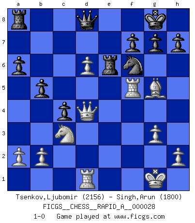 Last move : 1-0 2007 October 11 17:39:39 [Event "FICGS__CHESS__RAPID_A__000028"] [Site "FICGS"] [Date "2007.10.06"] [Round "1"] [White "Tsenkov,Ljubomir"] [Black "Singh,Arun"] [Result "1-0"] [WhiteElo "2156"] [BlackElo "1800"] 1.c4 Nf6 2.Nc3 e6 3.e4 d6 4.d4 Nbd7 5.f4 c5 6.d5 exd5 7.cxd5 Be7 8.Nf3 O-O 9.Bd3 a6 10.O-O b5 11.e5 dxe5 12.fxe5 Ng4 13.d6 Bh4 14.g3 Ndxe5 15.Nxh4 Nxd3 16.Qxd3 c4 17.Qd4 Re8 18.Bd2 Be6 19.Nf5 Bxf5 20.Rxf5 Nf6 21.Bg5 Re6 22.Rd1 1-0 English : Mikenas-Carls variation Kingside Castling by player Black (move 8) Kingside Castling by player White (move 10) Player White won this chess game. Follow this game move after move (download)Chess is as much a mystery as women. (Purdy) Über Karpov: Er war und ist ein Vertreter der russischen Reaktionäre. Das steckt tief in seiner Seele, wehalb ich nicht nett mit ihm umgehen kann. (Viktor Kortschnoi) Siempre es mucho mejor sacrificar las piezas de tu oponente. (Savielly Tartakover) Pour moi, les échecs ne sont pas un jeu mais un art. (Alexandre Alekhine) Art is the triumph over chaos. (John Cheever)