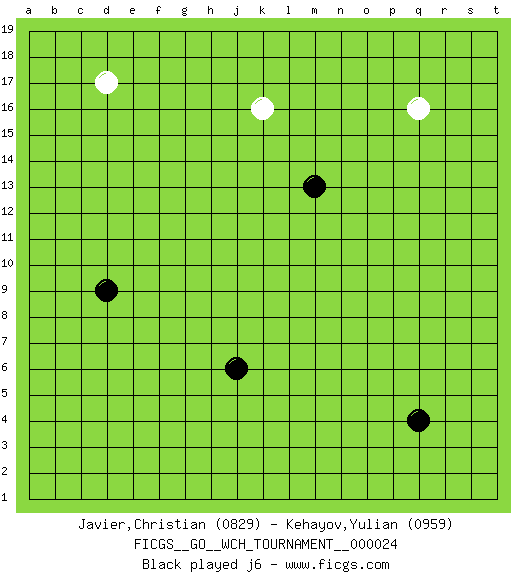 Last move : 1-0 2026 February 1 13:5:55 [Event "FICGS__GO__WCH_TOURNAMENT__000024"] [Site "FICGS"] [Date "2025.08.07"] [Round "1"] [Black "Javier,Christian"] [White "Kehayov,Yulian"] [Result "1-0"] [Rating 1 "0829"] [Rating 2 "0959"] 1.d9 q16 2.q4 d17 3.m13 k16 4.j6 k4 5.d4 h4 6.l6 l4 7.m6 q6 8.d15 d13 9.q8 o6 10.k5 j5 11.j3 j4 12.k7 h3 13.h2 j2 14.k2 k3 15.m4 m3 16.n5 o5 17.l2 m2 18.n3 g2 19.h6 l1 20.o4 n8 21.g5 g4 22.f6 f4 23.e4 e3 24.g3 f3 25.e5 d3 26.c4 c3 27.g7 r7 28.p8 p9 29.j14 q9 30.p5 p6 31.p3 n6 32.n7 o7 33.o9 o8 34.n9 r8 35.r9 r5 36.m8 q5 37.l8 q10 38.h8 s9 39.j7 c16 40.o2 r4 41.r10 r11 42.s10 s11 43.t10 t9 44.j9 c14 45.o10 p11 46.k8 b4 47.c5 b5 48.k10 c7 49.q12 q11 50.l9 c6 51.m10 q13 52.d6 c9 53.d7 p4 54.e8 c8 55.l11 q3 56.s6 q7 57.f8 p12 58.m12 e15 59.c10 p2 60.p1 o3 61.p13 q14 62.o11 o13 63.g9 n4 64.b9 b8 65.j1 b10 66.n1 n2 67.m1 o1 68.o12 1-0 Follow this game move after move (download)Beginner's games are surprising, often incoherent and incomprehensible. When you improve, your game gains in consistency but flirts with stupidity: you become satisfied with truisms and mechanical movements, you try to obtain a feeling for clearness and style the easy way. (Pierre Audouard) Control your own destiny or someone else will. (Jack Welch)
