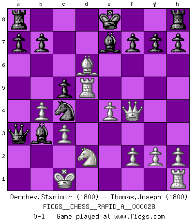 Last move : 0-1 2007 October 15 18:51:56 [Event "FICGS__CHESS__RAPID_A__000028"] [Site "FICGS"] [Date "2007.10.06"] [Round "1"] [White "Denchev,Stanimir"] [Black "Thomas,Joseph"] [Result "0-1"] [WhiteElo "1800"] [BlackElo "1800"] 1.d4 Nf6 2.Nf3 e6 3.Nc3 c5 4.d5 exd5 5.Nxd5 Nxd5 6.Qxd5 Nc6 7.e4 Be7 8.Bf4 d6 9.Bb5 Qa5+ 10.c3 Qxb5 11.O-O-O Be6 12.Qd2 Bxa2 13.Bxd6 Na5 14.Qf4 Nc4 15.b4 Qa4 16.Rd5 Bb3 17.Nd2 Qa3+ 0-1 Queen's pawn game Queenside Castling by player White (move 11) Player Black won this chess game. Follow this game move after move (download)In Chess, at least, the brave inherit the earth. (Edmar Mednis) Woher wissen wir, daß der Neanderthaler Blindschach gespielt hat? -- Bei Ausgrabungen wurden keine Schachbretter und Figuren gefunden. (Anonymous) Aquellos que dicen que entienden al Ajedrez, no entienden nada. (Robert Hubner) Ce qui caractérise les parties de combat, c'est que si le défenseur a constamment de difficiles problèmes à résoudre, l'attaquant doit chercher sans relâche de nouvelles possibilités d'attaque. (Koblentz) True nature is revealed in times of difficulty. (Chinese proverb)