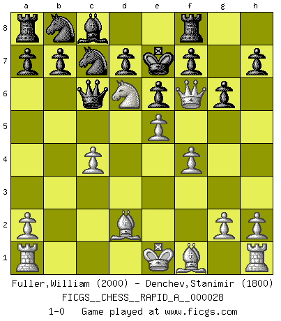 Last move : 1-0 2007 October 11 13:48:14 [Event "FICGS__CHESS__RAPID_A__000028"] [Site "FICGS"] [Date "2007.10.06"] [Round "1"] [White "Fuller,William"] [Black "Denchev,Stanimir"] [Result "1-0"] [WhiteElo "2000"] [BlackElo "1800"] 1.e4 e6 2.d4 c5 3.Nf3 Nf6 4.Nc3 cxd4 5.Nxd4 Bb4 6.e5 Nd5 7.Bd2 Bxc3 8.bxc3 Qc7 9.f4 Nxc3 10.Qf3 Nd5 11.Nb5 Qc6 12.Nd6+ Kf8 13.Qh5 g6 14.Qh6+ Ke7 15.Qg7 Rf8 16.c4 Nc7 17.Qf6+ 1-0 French defense Player White won this chess game. Follow this game move after move (download)As one by one I mowed them down, my superiority soon became apparent. (Jose Capablanca) Es gibt Leute, die glauben, alles wäre vernünftig, was man mit einem ernsthaften Gesicht tut. (Georg Christoph Lichtenberg) Coloca el contenido del tablero de Ajedrez en un sombrero, agita las piezas vigorosamente, derrámalas en el tablero desde una altura de medio metro y así obtienes el estilo de Wilhelm Steinitz. (H. E. Bird) On n'a jamais que l'âge auquel on a commence à jouer aux échecs car après on cesse de vieillir. (Capablanca) There is a great deal of difference between an eager man who wants to read a book and a tired man who wants a book to read. (G.K. Chesterton)