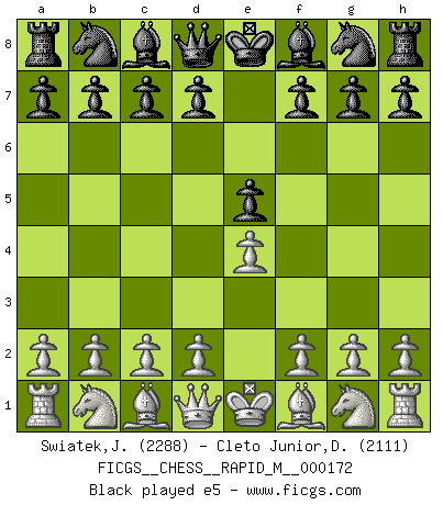 Last move : 1/2-1/2 2025 November 11 20:53:15 [Event "FICGS__CHESS__RAPID_M__000172"] [Site "FICGS"] [Date "2025.08.10"] [Round "1"] [White "Swiatek,Janusz"] [Black "Cleto Junior,Dirceu"] [Result "1/2-1/2"] [WhiteElo "2288"] [BlackElo "2111"] 1.e4 e5 2.Nf3 Nc6 3.Bb5 a6 4.Ba4 Nf6 5.O-O Be7 6.Re1 b5 7.Bb3 O-O 8.a4 b4 9.a5 Bb7 10.d3 Rb8 11.Nbd2 Bc5 12.c3 h6 13.h3 Re8 14.Qc2 d6 15.Nf1 Bc8 16.Ba4 Bd7 17.Bd2 Ne7 18.d4 bxc3 19.bxc3 exd4 20.cxd4 Bb4 21.Bxb4 Rxb4 22.Bb3 d5 23.exd5 Nfxd5 24.Ng3 Be6 25.Ba4 Bd7 26.Bb3 Nf4 27.Qa2 Be6 28.Bxe6 fxe6 29.Rxe6 Nxe6 30.Qxe6+ Kh7 31.Qxa6 c5 32.Qd3+ Kh8 33.a6 Qd5 34.Re1 c4 35.Qc2 Rb6 36.Re5 Qc6 37.Kh2 Rxa6 1/2-1/2 Follow this game move after move (download)I have never in my life played the French Defence, which is the dullest of all openings. (Wilhelm Steinitz) Kann Schach nicht schließlich das Nationalspiel der Deutschen werden? Und welche weiteren Ausblicke bieten sich dann dar! Welche Hebung des allgemeinen Kultur-Niveaus, ja der Moral, wenn das Schachbrett den Kartentisch verdrängen würde! Wahrlich, ein Ziel, des Schweißes der Edlen wert! (Siegbert Tarrasch) ¿Que sería del Ajedrez sin errores graciosos?. (Kurt Richter) A chaque perte on perd un peu de soi. (Joël Lautier) Computer Science is no more about computers than astronomy is about telescopes. (Edsger W. Dijkstra)
