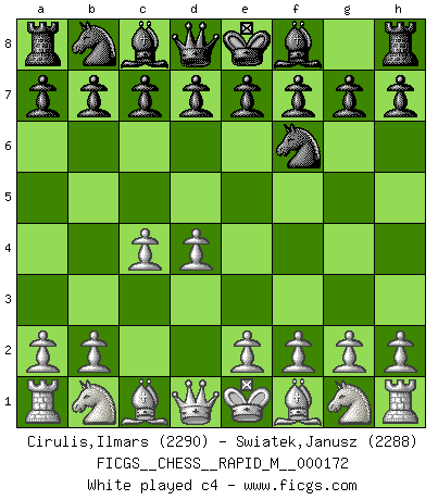 Last move : 1/2-1/2 2025 October 4 20:39:50 [Event "FICGS__CHESS__RAPID_M__000172"] [Site "FICGS"] [Date "2025.08.10"] [Round "1"] [White "Cirulis,Ilmars"] [Black "Swiatek,Janusz"] [Result "1/2-1/2"] [WhiteElo "2290"] [BlackElo "2288"] 1.d4 Nf6 2.c4 e6 3.Nf3 d5 4.cxd5 exd5 5.Nc3 c6 6.Qc2 g6 7.h3 Qc7 8.g3 Bf5 9.Qb3 Nbd7 10.Bg2 h6 11.Bf4 Qb6 12.g4 Be4 13.O-O Qxb3 14.axb3 Be7 15.Ne5 Bxg2 16.Kxg2 Nxe5 17.Bxe5 O-O 18.f3 Nd7 19.Bf4 g5 20.Bg3 f5 21.e4 fxe4 1/2-1/2 Follow this game move after move (download)A Chess game is a dialogue, a conversation between a player and his opponent. Each move by the opponent may contain threats or be a blunder, but a player cannot defend against threats or take advantage of blunders if he does not first ask himself: What is my opponent planning after each move ? (Bruce A. Moon) Ich moechte nie einem Club beitreten, der Leute wie mich als Mitglieder aufnimmt. (Woody Allen) Nada excita más a Grandes Maestros aburridos que una novedad teórica. (Dominic Lawson) Comme les marins qui ont mille raisons différentes d'aller en mer, les joueurs d'échecs en ont tout autant avant de s'installer devant une table et jouer... (Vincent Bertignac, philosophe) The only thing that matters is the evidence. (Horatio Caine, C.S.I. Miami)