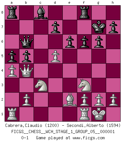 Last move : 0-1 2006 September 10 18:10:8 [Event "FICGS__CHESS__WCH_STAGE_1_GROUP_05__000001"] [Site "FICGS"] [Date "2006.07.01"] [Round "1"] [White "Cabrera,Claudio"] [Black "Secondi,Alberto"] [Result "0-1"] [WhiteElo "1200"] [BlackElo "1594"] 1.e4 c5 2.Nf3 Nc6 3.c3 g6 4.Be2 Bg7 5.d4 cxd4 6.cxd4 e6 7.Nc3 Nf6 8.O-O O-O 9.Bg5 a6 10.e5 b5 11.exf6 Bxf6 12.Bh6 Bg7 13.Bxg7 Kxg7 14.d5 Nb4 15.Qd4+ f6 16.Qxb4 Qb6 17.a4 a5 0-1 This chess game has been lost on time (started : 2006.07.01 16:5:54) Sicilian defense Kingside Castling by player White (move 8) Kingside Castling by player Black (move 8) Player Black won this chess game. Follow this game move after move (download)Why must I lose to this idiot ? (Aron Nimzovich) Es gibt zwei Arten von Opfern: Korrekte und meine. (Mikhail Nekhemyevich Tal) Los Peones son el alma de una partida de Ajedrez. (Francois Andre Danican Philidor) Je ne crois pas en la psychologie, je crois aux bons coups. (Robert Fischer) Two beer, or not two beer. (Unknown)