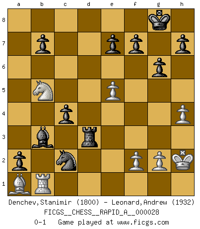 Last move : 0-1 2007 December 9 13:8:37 [Event "FICGS__CHESS__RAPID_A__000028"] [Site "FICGS"] [Date "2007.10.06"] [Round "1"] [White "Denchev,Stanimir"] [Black "Leonard,Andrew"] [Result "0-1"] [WhiteElo "1800"] [BlackElo "1932"] 1.Nf3 Nf6 2.b3 g6 3.Bb2 Bg7 4.e4 O-O 5.e5 Nh5 6.d4 d6 7.Bd3 Nc6 8.O-O Nf4 9.Qd2 Nxd3 10.Qxd3 dxe5 11.dxe5 Qxd3 12.cxd3 Nb4 13.Ne1 Be6 14.Nd2 Rfd8 15.d4 Bxe5 16.dxe5 Rxd2 17.Bc3 Rxa2 18.Nf3 a5 19.Nd4 Bd5 20.Rfe1 c5 21.Nb5 Rxa1 22.Rxa1 Bxb3 23.Nc7 Rd8 24.h4 a4 25.Nb5 Nc2 26.Rb1 c4 27.Kh2 Rd5 28.Nc7 Rd3 29.Nb5 a3 30.Ba1 a2 0-1 Reti Opening Kingside Castling by player Black (move 4) Kingside Castling by player White (move 8) Player Black won this chess game. Follow this game move after move (download)It's always better to sacrifice your opponent's men. (Savielly Tartakover) Wenn Capablanka heute auf der Schachbühne erscheinen würde, hätte er ein halbes Jahr gebraucht um sich die Schachtheorie anzueignen. Und dann hätte er alles und jeden besiegt. (Mikhail Moiseyevich Botvinik) Es el objetivo de la escuela moderna no tratar cada posición de acuerdo a una regla general, sino de acuerdo al principio inherente en la posición. (Richard Reti) Il (Jacob Murray) ne joue pas pour le bon coup, mais pour le meilleur. (Eloi Relange) Locking firmely the window serves nothing, only small thiefs pass through there, the big thiefs enter through the front door. (Luc-Olivier Leclerc)