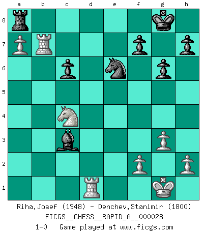 Last move : 1-0 2007 October 12 15:36:48 [Event "FICGS__CHESS__RAPID_A__000028"] [Site "FICGS"] [Date "2007.10.06"] [Round "1"] [White "Riha,Josef"] [Black "Denchev,Stanimir"] [Result "1-0"] [WhiteElo "1948"] [BlackElo "1800"] 1.d4 d5 2.c4 c6 3.Nf3 Nf6 4.Nc3 dxc4 5.a4 Bf5 6.e3 e6 7.Bxc4 Be7 8.O-O O-O 9.Qe2 Ne4 10.Bd3 Nxc3 11.bxc3 Bxd3 12.Qxd3 Nd7 13.e4 Nf6 14.c4 Qc7 15.e5 Ne8 16.Rb1 g6 17.d5 cxd5 18.cxd5 exd5 19.Qxd5 Qc6 20.Qxc6 bxc6 21.Rb7 Bc5 22.Bh6 Ng7 23.e6 Nxe6 24.Bxf8 Rxf8 25.a5 Rc8 26.Ne5 Nd8 27.Rd7 Bb4 28.Rxa7 Bc3 29.Nc4 Ne6 30.Rd1 Rb8 31.a6 Nc5 32.g3 Ne6 33.Rb7 Ra8 34.a7 1-0 QGD Slav : Dutch variation Kingside Castling by player White (move 8) Kingside Castling by player Black (move 8) Player White won this chess game. Follow this game move after move (download)Could we look into the head of a Chess player, we should see there a whole world of feelings, images, ideas, emotion and passion. (Alfred Binet) Kombinieren und Schwarzhandel gehören verboten. (Savielly Grigorievitsch Tartakower) Una victoria por una combinación errónea, aunque sea espectacular, me llena de horror artístico. (Wilhelm Steinitz) Botvinnik disait en comparant les échecs à la musique: Il existe une science dont le but est l'étude de l'acoustique et des sons. Mais il y a aussi un art qui se sert de l'océan des sons : c'est la musique. De toute évidence, il en est de même pour la pensée. La logique est l'étude des lois de la réflexion et les échecs reflètent, en tant qu'art, le côté logique de la réflexion, sous la forme d'images artistiques... Extrait de Fischer - Spassky, Reykjavik 1972 par Alexander & F. Wyndham (Ed. Solar), p 37. However beautiful the strategy, you should occasionally look at the results. (Winston Churchill)