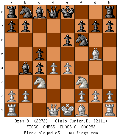 Last move : 1/2-1/2 2025 September 13 10:56:7 [Event "FICGS__CHESS__CLASS_A__000293"] [Site "FICGS"] [Date "2025.08.10"] [Round "1"] [White "Ozen,Bahadir"] [Black "Cleto Junior,Dirceu"] [Result "1/2-1/2"] [WhiteElo "2272"] [BlackElo "2111"] 1.Nf3 d5 2.d4 Nf6 3.c4 e6 4.Nc3 dxc4 5.e4 Bb4 6.Bg5 c5 7.Bxc4 cxd4 8.Nxd4 Bxc3+ 9.bxc3 Qa5 10.Bb5+ Nbd7 11.Bxf6 Qxc3+ 12.Kf1 gxf6 13.h4 a6 14.Rh3 Qa5 15.Be2 Nc5 16.Nb3 Nxb3 17.Qxb3 Rb8 18.Rd1 Bd7 19.Qg3 Rd8 20.Qf4 Qe5 21.Qd2 Rg8 22.Kg1 Qxe4 23.Bf1 Qa4 24.Rd3 Rg4 25.Rd6 Rxh4 26.g3 Re4 1/2-1/2 Follow this game move after move (download)The tactician must know what to do whenever something needs doing; the strategist must know what to do when nothing needs doing. (Savielly Tartakover) Oft bringt ein stiller Zug das Erdbeben. (Richard Reti) Uno no tiene que jugar muy bien, es suficiente jugar mejor que el oponente. (Siegbert Tarrasch) Je ne suis pas le dernier à jouer lâchement des coups douteux pendant le zeïtnot de l'adversaire pour l'achever: en effet les coups qui font le plus peur sont ceux que l'on ne comprend pas. Je me fais souvent peur quand je joue. (Un professeur anonyme) Life is like a game of cards: the hand you are dealt represents determinism; the way you play it is free will. (Jawaharlal Nehru)
