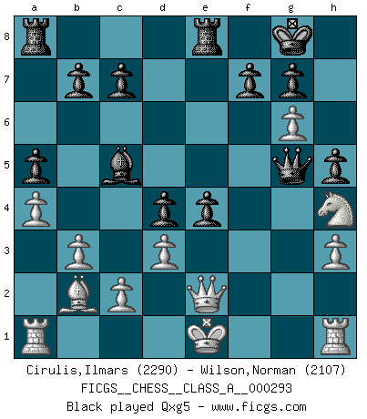 Last move : 1/2-1/2 2025 September 8 10:46:11 [Event "FICGS__CHESS__CLASS_A__000293"] [Site "FICGS"] [Date "2025.08.10"] [Round "1"] [White "Cirulis,Ilmars"] [Black "Wilson,Norman"] [Result "1/2-1/2"] [WhiteElo "2290"] [BlackElo "2107"] 1.f4 d5 2.b3 Bg4 3.h3 Bh5 4.g4 Bg6 5.e3 e6 6.Nf3 h5 7.g5 Nc6 8.Bb5 Nge7 9.Bb2 a6 10.Bxc6+ Nxc6 11.d3 Bb4+ 12.Nbd2 O-O 13.a3 Bc5 14.Qe2 a5 15.a4 Re8 16.Nh4 e5 17.f5 Nd4 18.exd4 exd4 19.Ne4 dxe4 20.fxg6 Qxg5 21.gxf7+ Kxf7 22.Ng2 Bb4+ 23.Kf1 exd3 24.Qxd3 Ra6 25.Bxd4 Kg8 26.c3 Rf8+ 27.Kg1 Rg6 28.Qe2 Bxc3 29.Be3 Qd5 30.Rf1 Re8 31.Qf3 Qxb3 32.Kh2 Bf6 33.Rhg1 h4 34.Qh5 Qf7 35.Qxa5 Rxg2+ 36.Rxg2 Rxe3 37.Qa8+ Re8 38.Qxb7 Be5+ 39.Kg1 Bd4+ 40.Kh2 Qxf1 41.Qd5+ Qf7 42.Qxd4 c5 43.Qxh4 c4 44.Qg3 1/2-1/2 Follow this game move after move (download)Chess is the gymnasium of the mind. (Blaise Pascal) Vom Schach wurde gesagt das Leben sei dafür nicht lange genug. Aber das ist der Fehler des Lebens, nicht des Schach'. (Irving Chernev) Aquellos que dicen que entienden al Ajedrez, no entienden nada. (Robert Hubner) Il s'avisa de me proposer d'apprendre les échecs qu'il jouait un peu... me voilà forcené des échecs. J'achète un échiquier, je m'enferme dans ma chambre, j'y passe des jours et des nuits à vouloir apprendre par cur toutes les parties. (Jean-Jacques Rousseau, Confessions) The only difference between a tax man and a taxidermist is that the taxidermist leaves the skin. (Mark Twain)