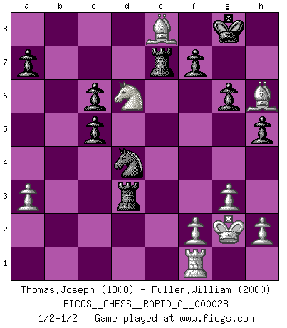 Last move : 1/2-1/2 2007 October 15 19:16:59 [Event "FICGS__CHESS__RAPID_A__000028"] [Site "FICGS"] [Date "2007.10.06"] [Round "1"] [White "Thomas,Joseph"] [Black "Fuller,William"] [Result "1/2-1/2"] [WhiteElo "1800"] [BlackElo "2000"] 1.c4 e5 2.Nc3 Nf6 3.g3 Bb4 4.Bg2 O-O 5.Nf3 Nc6 6.O-O e4 7.Ng5 Bxc3 8.bxc3 Re8 9.Qc2 Qe7 10.d3 exd3 11.exd3 h6 12.Nf3 d5 13.cxd5 Nxd5 14.Bb2 Bf5 15.Nh4 Be6 16.c4 Nf4 17.Be4 Nb4 18.Qd2 Nh3+ 19.Kh1 Rad8 20.a3 Na6 21.Rae1 Nc5 22.Bf5 Qd6 23.Rxe6 Nxe6 24.Bxh3 Qxd3 25.Qxd3 Rxd3 26.Nf5 h5 27.Kg1 Rb3 28.Bc1 g6 29.Ne3 Nd4 30.Kg2 c6 31.c5 Rd3 32.Nc4 Re2 33.Nd6 b6 34.Bd7 bxc5 35.Be8 Re7 36.Bg5 Kf8 37.Bh6+ Kg8 38.Bg5 Kf8 39.Bh6+ Kg8 40.Bg5 Kf8 41.Bh6+ Kg8 1/2-1/2 English : Bremen, Smyslov system Kingside Castling by player Black (move 4) Kingside Castling by player White (move 6) This chess game ended in a draw. Follow this game move after move (download)Chess is the art which expresses the science of logic. (Mikhail Botvinnik) Ich spiele ehrlich und spiele, um zu gewinnen. Wenn ich verliere nehme ich meine Medizin. (Robert James Fischer) Un Peón pasado es un criminal, quién debe ser mantenido bajo candado y llave. Leves medidas, tales como vigilancia policiaca, no son suficientes. (Aaron Nimzovich) J'ai vu le vaincu d'Echecs jouer des années durant dans l'espoir de la fête de la victoire. Car tu es plus riche de ce qu'elle existe si même elle n'est point pour toi. Ainsi de la perle du fond des mers. (Antoine de Saint-Exupéry) Don't anthropomorphize computers - they hate it. (Anonymous)