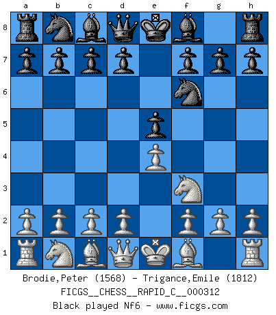 Last move : 1-0 2025 November 3 14:11:25 [Event "FICGS__CHESS__RAPID_C__000312"] [Site "FICGS"] [Date "2025.08.15"] [Round "1"] [White "Brodie,Peter"] [Black "Trigance,Emile"] [Result "1-0"] [WhiteElo "1568"] [BlackElo "1812"] 1.e4 e5 2.Nf3 Nf6 3.Bc4 Nxe4 4.Qe2 d5 5.Bd3 Bd6 6.Nc3 Nxc3 7.dxc3 Qe7 8.O-O e4 9.Bb5+ c6 10.Ba4 exf3 11.Qxe7+ Bxe7 12.gxf3 b5 13.Bb3 O-O 14.Bf4 Nd7 15.Rae1 Bc5 16.Be3 Bxe3 17.Rxe3 1-0 This chess game has been lost on time (started : 2025.08.15 9:30:58) Follow this game move after move (download)Spassky will not be psyched out by Fischer. (Mike Goodall) Heutzutage gewinnt im Turnier nicht derjenige Spieler, der weitreichende Pläne entwirft, sondern einfach jener, der Zug um Zug kämpft. (David Bronstein) No todos los artistas son jugadores de Ajedrez, pero todos los jugadores de Ajedrez son artistas. (Marcel Duchamp) J'ai toujours senti une vague pitié pour l'homme qui ne connaît rien aux échecs, tout comme j'en aurais pour un homme ignorant de l'amour. Les Echecs, comme la musique ou comme l'amour, ont le pouvoir de rendre heureux. (Siegbert Tarrasch) Life is like a game of cards: the hand you are dealt represents determinism; the way you play it is free will. (Jawaharlal Nehru)