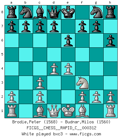 Last move : 1/2-1/2 2025 September 7 22:12:20 [Event "FICGS__CHESS__RAPID_C__000312"] [Site "FICGS"] [Date "2025.08.15"] [Round "1"] [White "Brodie,Peter"] [Black "Budnar,Milos"] [Result "1/2-1/2"] [WhiteElo "1568"] [BlackElo "1560"] 1.Nc3 e6 2.e4 Bb4 3.Nf3 h6 4.d4 Bxc3 5.bxc3 Nf6 6.Bd3 d5 7.e5 Ne4 8.Bxe4 dxe4 9.Nd2 O-O 10.Nxe4 Qh4 11.Qf3 Qe7 12.O-O Na6 13.a3 c5 14.dxc5 Nxc5 15.Nxc5 Qxc5 16.Qe3 b6 17.Qxc5 bxc5 18.Be3 c4 19.Rab1 Ba6 20.Rfd1 Rfd8 21.Rd6 Rxd6 22.exd6 Rd8 23.Bc5 Rd7 24.Rb8+ Kh7 25.f4 1/2-1/2 Follow this game move after move (download)There are two classes of men; those who are content to yield to circumstances and who play whist; those who aim to control circumstances, and who play Chess. (Mortimer Collins) Woher wissen wir, daß der Neanderthaler Blindschach gespielt hat? -- Bei Ausgrabungen wurden keine Schachbretter und Figuren gefunden. (Anonymous) Una buena ofensiva y una buena defensa, comienzan ambas con un buen desarrollo. (Bruce A. Moon) Ce qui caractérise les parties de combat, c'est que si le défenseur a constamment de difficiles problèmes à résoudre, l'attaquant doit chercher sans relâche de nouvelles possibilités d'attaque. (Koblentz) Man with more than one clock never knows what time it is. (Chinese thought)