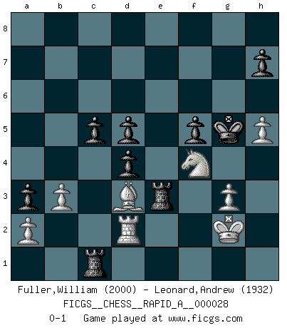 Last move : 0-1 2008 February 18 0:37:3 [Event "FICGS__CHESS__RAPID_A__000028"] [Site "FICGS"] [Date "2007.10.06"] [Round "1"] [White "Fuller,William"] [Black "Leonard,Andrew"] [Result "0-1"] [WhiteElo "2000"] [BlackElo "1932"] 1.e4 e5 2.Nf3 Nc6 3.d4 exd4 4.Nxd4 Nf6 5.Nxc6 bxc6 6.e5 Qe7 7.Qe2 Nd5 8.c4 Ba6 9.b3 g6 10.g3 Bg7 11.Bb2 O-O 12.Bg2 Rae8 13.O-O Bxe5 14.Qxe5 Qxe5 15.Bxe5 Rxe5 16.cxd5 Bxf1 17.Kxf1 cxd5 18.Nc3 c6 19.Rd1 Rb8 20.Rd4 Rbe8 21.Bf3 Re1+ 22.Kg2 Rc1 23.Nd1 a5 24.Ne3 f5 25.h4 Kg7 26.Ra4 Rc5 27.Rd4 Rb8 28.Bd1 Rc1 29.Rd2 Kf6 30.f4 Re8 31.Kf2 Ra1 32.h5 g5 33.fxg5+ Kxg5 34.Bf3 Re7 35.Ng2 d4 36.Be2 d6 37.Nf4 c5 38.Bd3 Rc1 39.Kg2 Re3 40.Ne2 Re1 41.Nf4 Re7 42.Rf2 R7e5 43.Bb5 R1e3 44.Rd2 a4 45.Bd3 a3 46.Rf2 Re1 47.Bc2 R5e3 48.Nh3+ Kh6 49.Nf4 d5 50.Bd3 Rd1 51.Bc2 Ra1 52.Bd3 Kg5 53.Rd2 Rc1 0-1 Scotch : Mieses variation Kingside Castling by player Black (move 11) Kingside Castling by player White (move 13) Player Black won this chess game. Follow this game move after move (download)All that matters on the Chessboard is good moves. (Bobby Fischer) Viele Opfer benötigen überhaupt keine konkrete Berechnung. Es genügt sich die entstehende Position kurz vorzustellen, um uns davon zu überzeugen, dass das Opfer korrekt ist. (Mikhail Nekhemyevich Tal) Aquel que ve no otra dirección en el juego que la de dar Jaque Mate a su oponente, nunca será un buen jugador de Ajedrez. (Euwe) C'est une question de caractère, Beaucoup de gens perdent leur motivation très vite. D'autres, ils sont rares, peuvent la conserver très longtemps. J'aime les échecs, encore aujourd'hui je suis heureux d'analyser des parties. J'aime toujours gagner, je déteste encore perdre. Bien jouer est important pour mon intégrité intellectuelle et morale. Et puis les échecs vivent en ce moment une période historique grâce à Internet. Ils se développent dans les systèmes éducatifs à travers le monde. Ils sortent de leur ghetto, et c'est mon rôle de mener à bien cette révolution. (Gary Kasparov) Those who make the worst use of their time are the first to complain of its brevity. (Jean de la Bruyere)