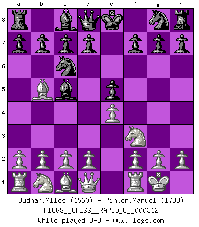 Last move : 1-0 2025 October 8 17:57:12 [Event "FICGS__CHESS__RAPID_C__000312"] [Site "FICGS"] [Date "2025.08.15"] [Round "1"] [White "Budnar,Milos"] [Black "Pintor,Manuel"] [Result "1-0"] [WhiteElo "1560"] [BlackElo "1739"] 1.e4 e5 2.Nf3 Nc6 3.Bb5 Bc5 4.O-O Qf6 5.d3 Nd4 6.c3 Nxb5 7.a4 Nd6 8.b4 Nxe4 9.dxe4 Be7 10.Bg5 Qd6 11.Bxe7 Qxe7 12.Na3 d6 13.h3 c6 14.b5 Nf6 15.Qe2 O-O 16.c4 h6 17.g4 Nxg4 18.hxg4 Bxg4 19.Kg2 Qf6 20.Rh1 h5 21.Rh2 g5 22.Qe3 Bxf3+ 23.Qxf3 Qxf3+ 24.Kxf3 h4 25.Rag1 f6 26.Ke3 Kf7 27.f3 Ke6 28.a5 c5 29.Rg4 b6 30.a6 Rh8 31.Rh3 Rag8 32.Nb1 f5 33.exf5 Kxf5 34.Nc3 Re8 35.Ne4 Reg8 36.Nxd6 Ke6 37.Ne4 Kf5 38.Nc3 Rd8 39.Nd5 Rhe8 40.Rh1 Rd7 41.Rg2 Rh7 42.Rhg1 Rh5 43.Rh1 e4 44.f4 g4 45.Rhg1 g3 46.Nc3 Rh6 47.Nd5 Rh7 48.Nc3 Rd7 49.Nd5 Rg8 50.Rh1 Rh8 51.Rxg3 hxg3 52.Rxh8 Rg7 53.Rh5 Ke6 54.Rg5 Rxg5 55.fxg5 g2 56.Kf2 Kf5 57.Kxg2 Kxg5 58.Kf2 Kf5 59.Ke3 Ke5 60.Nc3 Kd6 61.Nxe4 Kc7 62.Nc3 Kd6 63.Ke4 Ke6 64.Nd5 Kd6 65.Nf4 Kc7 66.Ke5 Kd7 67.Ne6 Ke7 68.Kd5 Kd7 69.Ng7 Kc7 70.Ke6 Kd8 71.Kd6 Kc8 72.Kc6 Kb8 73.Ne8 Kc8 74.Nf6 Kb8 75.Nd7 Ka8 76.Nxb6 Kb8 77.Kxc5 axb6+ 78.Kxb6 Ka8 79.c5 1-0 Follow this game move after move (download)When I asked Fischer why he had not played a certain move in our game, he replied: 'Well, you laughed when I wrote it down !' (Mikhail Tal) Ich spiele ehrlich und spiele, um zu gewinnen. Wenn ich verliere nehme ich meine Medizin. (Robert James Fischer) Los asuntos humanos son como una partida de Ajedrez: solo aquellos que no lo toman seriamente, pueden ser llamados buenos jugadores. (Hung Tzu Ch'eng) J'ai vu le vaincu d'Echecs jouer des années durant dans l'espoir de la fête de la victoire. Car tu es plus riche de ce qu'elle existe si même elle n'est point pour toi. Ainsi de la perle du fond des mers. (Antoine de Saint-Exupéry) There are 10 types of people in this world: those who understand binary and those who don't. (Anonymous)