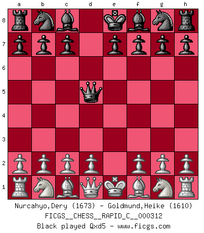 Last move : 1-0 2025 November 3 0:15:30 [Event "FICGS__CHESS__RAPID_C__000312"] [Site "FICGS"] [Date "2025.08.15"] [Round "1"] [White "Nurcahyo,Dery"] [Black "Goldmund,Heike"] [Result "1-0"] [WhiteElo "1673"] [BlackElo "1610"] 1.e4 d5 2.exd5 Qxd5 3.c4 Qa5 4.Nc3 Nf6 5.d3 c6 6.h3 Bf5 7.Bd2 Qc7 8.Nf3 e6 9.Nd4 Bd6 10.Nxf5 exf5 11.Be2 O-O 12.O-O Nbd7 13.Qc2 Rfe8 14.Kh1 Rad8 15.a3 Bf4 16.Rfe1 Bxd2 17.Qxd2 1-0 This chess game has been lost on time (started : 2025.08.15 9:30:58) Follow this game move after move (download)My style is somewhere between that of Tal and Petrosian. (Reshevsky) Moralische Siege zählen nicht. (Savielly Grigorievitsch Tartakower) El Ajedrez no es una pizca de inferior al violín, y tenemos un gran número de violinistas profesionales. (Mikhail Botvinnik) Les ravages du H expliquent la différence de niveau entre Tal et Thal [Abergel]. To send light into the darkness of men's hearts - such is the duty of the artist. (Schumann)