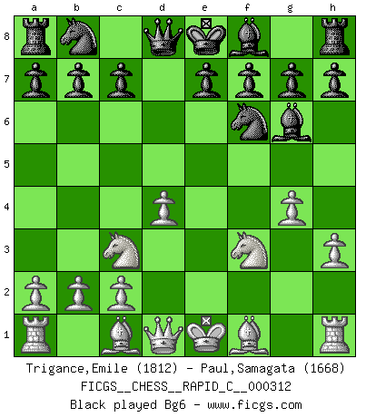Last move : 1-0 2025 September 16 16:29:37 [Event "FICGS__CHESS__RAPID_C__000312"] [Site "FICGS"] [Date "2025.08.15"] [Round "1"] [White "Trigance,Emile"] [Black "Paul,Samagata"] [Result "1-0"] [WhiteElo "1812"] [BlackElo "1668"] 1.d4 d5 2.e4 dxe4 3.Nc3 Nf6 4.f3 exf3 5.Nxf3 Bg4 6.h3 Bh5 7.g4 Bg6 8.Ne5 Qd6 9.Bf4 Qb4 10.Nxg6 hxg6 11.Qd2 c6 12.O-O-O Nbd7 13.Bg2 Nb6 14.a3 Qc4 15.Rhe1 e6 16.Bf1 1-0 Follow this game move after move (download)Chess mastery essentially consists of analyzing Chess positions accurately. (Mikhail Botvinnik) Die Elozahlen sind sehr schlecht für das Schach. Jetzt ist Schach eine Sportindustrie, die darauf zielt Elopunkte zu machen. (Miguel Najdorf) El estómago es una parte esencial del maestro de Ajedrez. (Bent Larsen) L'attaque fait le spectacle, la défense gagne les matchs. (Dicton footballistique) The faster the computer, the slower the brain. (Thibault de Vassal)
