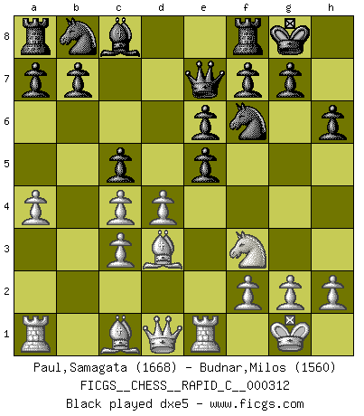 Last move : 1-0 2025 August 24 9:57:53 [Event "FICGS__CHESS__RAPID_C__000312"] [Site "FICGS"] [Date "2025.08.15"] [Round "1"] [White "Paul,Samagata"] [Black "Budnar,Milos"] [Result "1-0"] [WhiteElo "1668"] [BlackElo "1560"] 1.d4 e6 2.c4 Bb4 3.Nc3 Bxc3 4.bxc3 h6 5.e4 Qh4 6.Bd3 Qe7 7.Nf3 Nf6 8.a4 O-O 9.O-O d6 10.Re1 c5 11.e5 dxe5 12.Nxe5 Nc6 13.Nxc6 bxc6 14.Ba3 Qd7 15.Bxc5 Re8 16.h3 Bb7 17.Rb1 Ba6 18.Qc2 g6 19.Re3 Rab8 20.Rg3 Rxb1 21.Qxb1 e5 22.Bxg6 fxg6 23.Qxg6+ Kh8 24.Qxf6+ Kh7 25.Bxa7 Qxa7 26.Qg6+ Kh8 27.Qxe8+ Kh7 28.Qg8+ 1-0 Follow this game move after move (download)Chess is a fairy tale of 1001 blunders. (Savielly Tartakower) Im Reiche der Wirklichkeit ist man nie so glücklich wie im Reiche der Gedanken. (Arthur Schopenhauer) Ayuda a tus piezas para que ellas te puedan ayudar. (Paul Morphy) Celui qui prend des risques peut perdre, celui qui n'en prend pas perd toujours. (Xavier Tartacover) Somewhere in the world there is an epigram for every dilemma. (Hendrik Willem van Loon)