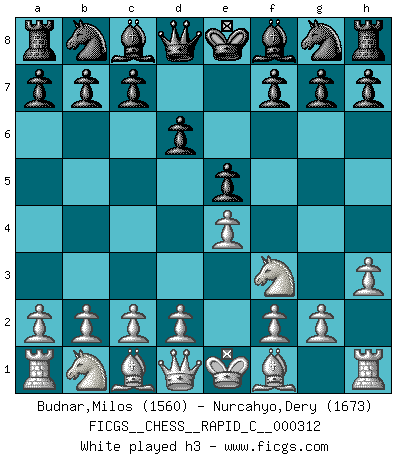 Last move : 0-1 2025 September 13 13:39:45 [Event "FICGS__CHESS__RAPID_C__000312"] [Site "FICGS"] [Date "2025.08.15"] [Round "1"] [White "Budnar,Milos"] [Black "Nurcahyo,Dery"] [Result "0-1"] [WhiteElo "1560"] [BlackElo "1673"] 1.e4 e5 2.Nf3 d6 3.h3 Be6 4.Bd3 Nc6 5.O-O Nf6 6.b3 Qd7 7.c3 h6 8.Bb5 O-O-O 9.d3 a6 10.Bc4 Kb8 11.d4 Bxc4 12.bxc4 exd4 13.Nxd4 Nxe4 14.Qg4 Qxg4 15.hxg4 Ne5 16.f3 Nf6 17.Rd1 Nxc4 18.Na3 Ne5 19.Bf4 Ng6 20.Bg3 Nd5 21.c4 Nb6 22.Rac1 Be7 23.Nf5 Bf6 24.Bf2 Nf4 25.Rd2 Nd7 26.Rb1 Rhe8 27.Re1 Ne5 28.c5 Nfd3 29.Rxd3 Nxd3 30.Rxe8 Rxe8 31.cxd6 Nxf2 32.Kxf2 cxd6 33.Nac4 d5 34.Ncd6 Rf8 35.f4 Kc7 0-1 Follow this game move after move (download)It is not enough to be a good player... you must also play well. (Siegbert Tarrasch) Wenn Dein Gegner dir ein Remis anbietet, versuch herauszufinden, weshalb er glaubt schlechter zu stehen. (Nigel Short) Tu eres para mi la Reina en d8 y yo soy el Peón en d7!!. (GM Eduard Gufeld) Les échecs c'est le défi de l'alpiniste, toujours plus haut, prêt à tout pour monter à l'assaut du Roi ennemi. Les échecs, c'est de la musique en mouvement, un ballet majestueux pour les yeux. C'est de la poésie composée par les fantômes du passé qui au même titre que Rimbaud ou Verlaine méritent notre admiration. Les échecs, c'est de la peinture ou le moindre mouvement modifie le tableau pour en faire un Picasso ou un Van Gogh. Les échecs, c'est tout et rien, c'est la vie et la mort. Jjulie33 sur le forum de France-Echecs. If you have any trouble condescending, find a Unix user to show you how it's done. (Scott Adams)
