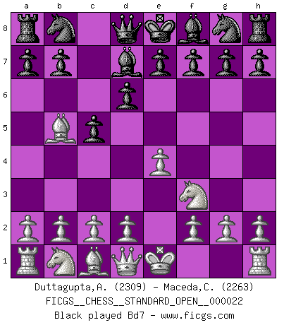 Last move : bxc4 2026 January 2 21:56:35 White clock - 93 days 09:09:25 (59 days 12:06:16) Black clock - 96 days 15:46:16 [Event "FICGS__CHESS__STANDARD_OPEN__000022"] [Site "FICGS"] [Date "2025.08.16"] [Round "2"] [White "Duttagupta,Aniruddha"] [Black "Maceda,Coco"] [Result "*"] [WhiteElo "2309"] [BlackElo "2263"] 1.e4 c5 2.Nf3 d6 3.Bb5+ Bd7 4.Bxd7+ Qxd7 5.c4 Nf6 6.Nc3 g6 7.d4 cxd4 8.Nxd4 Bg7 9.O-O O-O 10.b3 Nc6 11.Bb2 e6 12.Rc1 Rfd8 13.Nxc6 Qxc6 14.f3 a6 15.Kh1 Rac8 16.Qd2 Qc5 17.Na4 Qa7 18.Qg5 h6 19.Qa5 Nd7 20.Rfd1 Bxb2 21.Nxb2 Qe3 22.Qd2 Qxd2 23.Rxd2 Ne5 24.h3 g5 25.Rcd1 Rc6 26.Nd3 Nxd3 27.Rxd3 Kf8 28.Kh2 Ke7 29.e5 f6 30.exf6+ Kxf6 31.a4 b5 32.axb5 axb5 33.h4 bxc4 34.* Follow this game move after move (download)Examine moves that smite! A good eye for smites is far more important than a knowledge of strategical principles. (Purdy) Ich organisiere ein großes Turnier, was mich etwa 120000 Dollar kostet. Ich denke, das ist das erste Mal in der Schachgeschichte, daß ein Schachgroßmeister auch als Mäzen auftritt. (Miguel Najdorf) EL Ajedrez es como la vida. (Boris Spassky) Les échecs, c'est l'art d'analyser. (Mikhail Botvinnik) Live, lose, and learn, by observing your opponent how to win. (Amber Steenbock)