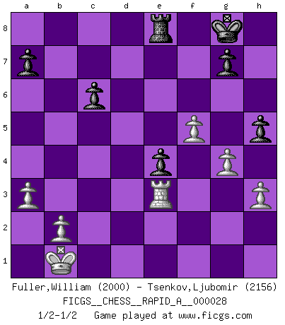 Last move : 1/2-1/2 2007 October 18 15:35:48 [Event "FICGS__CHESS__RAPID_A__000028"] [Site "FICGS"] [Date "2007.10.06"] [Round "1"] [White "Fuller,William"] [Black "Tsenkov,Ljubomir"] [Result "1/2-1/2"] [WhiteElo "2000"] [BlackElo "2156"] 1.e4 e5 2.Nf3 Nc6 3.d4 exd4 4.Nxd4 Bc5 5.Nxc6 Qf6 6.Qd2 dxc6 7.Nc3 Qe7 8.Qg5 Nf6 9.Be3 Bxe3 10.Qxe3 O-O 11.h3 Re8 12.O-O-O b5 13.Bd3 Nd7 14.f4 Nc5 15.e5 Be6 16.g4 Nxd3+ 17.Rxd3 f6 18.Rhd1 b4 19.Ne4 fxe5 20.f5 Bd5 21.c4 bxc3 22.Nxc3 Rad8 23.Nxd5 cxd5 24.Rxd5 Rxd5 25.Rxd5 e4 26.a3 c6 27.Ra5 Qf7 28.Rc5 Qd7 29.Kc2 Qd6 30.Rc4 Qh2+ 31.Kb1 Qh1+ 32.Rc1 Qf3 33.Re1 Qxe3 34.Rxe3 h5 1/2-1/2 Scotch game Kingside Castling by player Black (move 10) Queenside Castling by player White (move 12) This chess game ended in a draw. Follow this game move after move (download)The game of chess is the touchstone of the intellect. (Goethe) Ich habe die besten Aussichten, den ersten Preis zu gewinnen - denn jeder muss gegen Steinitz spielen, nur ich nicht! (Wilhelm Steinitz) Aquel que toma al Peón de Caballo de la Reina, se pasará la noche a dormir en la calle. (Anónimo) Les échecs sont utiles à l'exercice de la faculté de penser et à celle de l'imagination. Car nous devons posséder une méthode élaborée pour atteindre des buts partout où nous devons conduire notre raison. (Leibnitz) Luck is the residue of design. (John Milton)